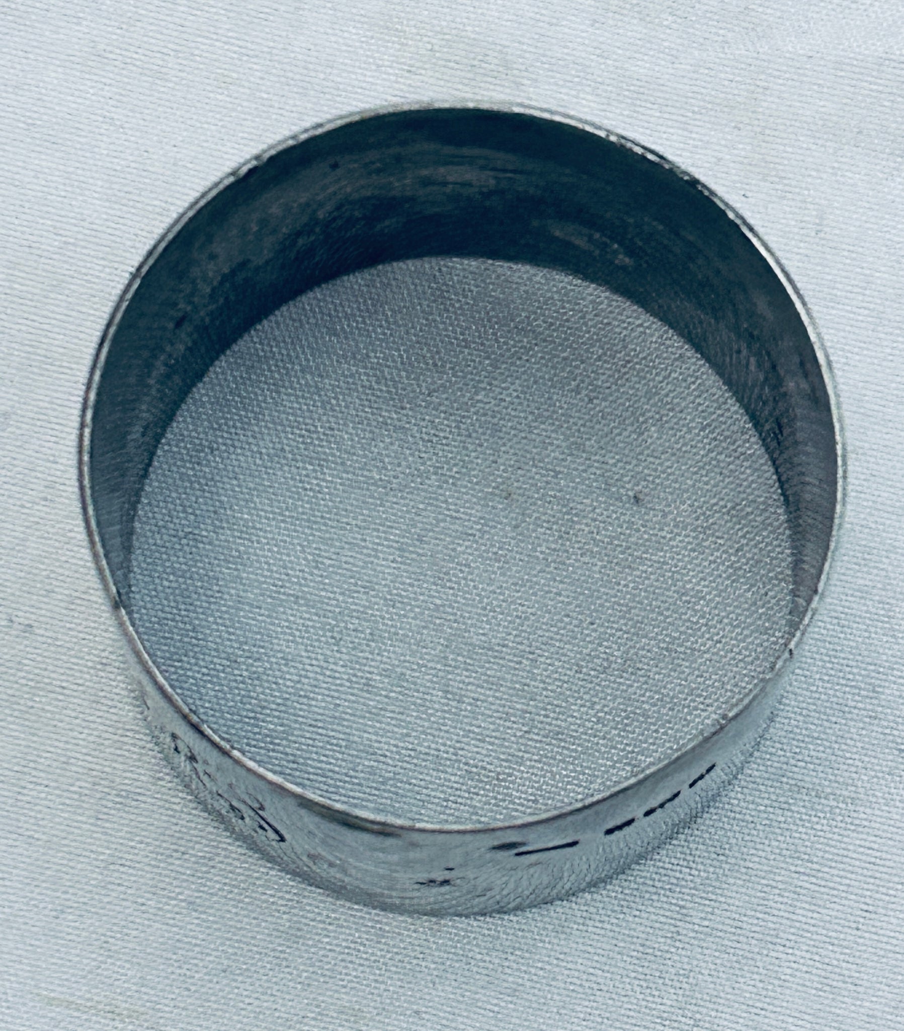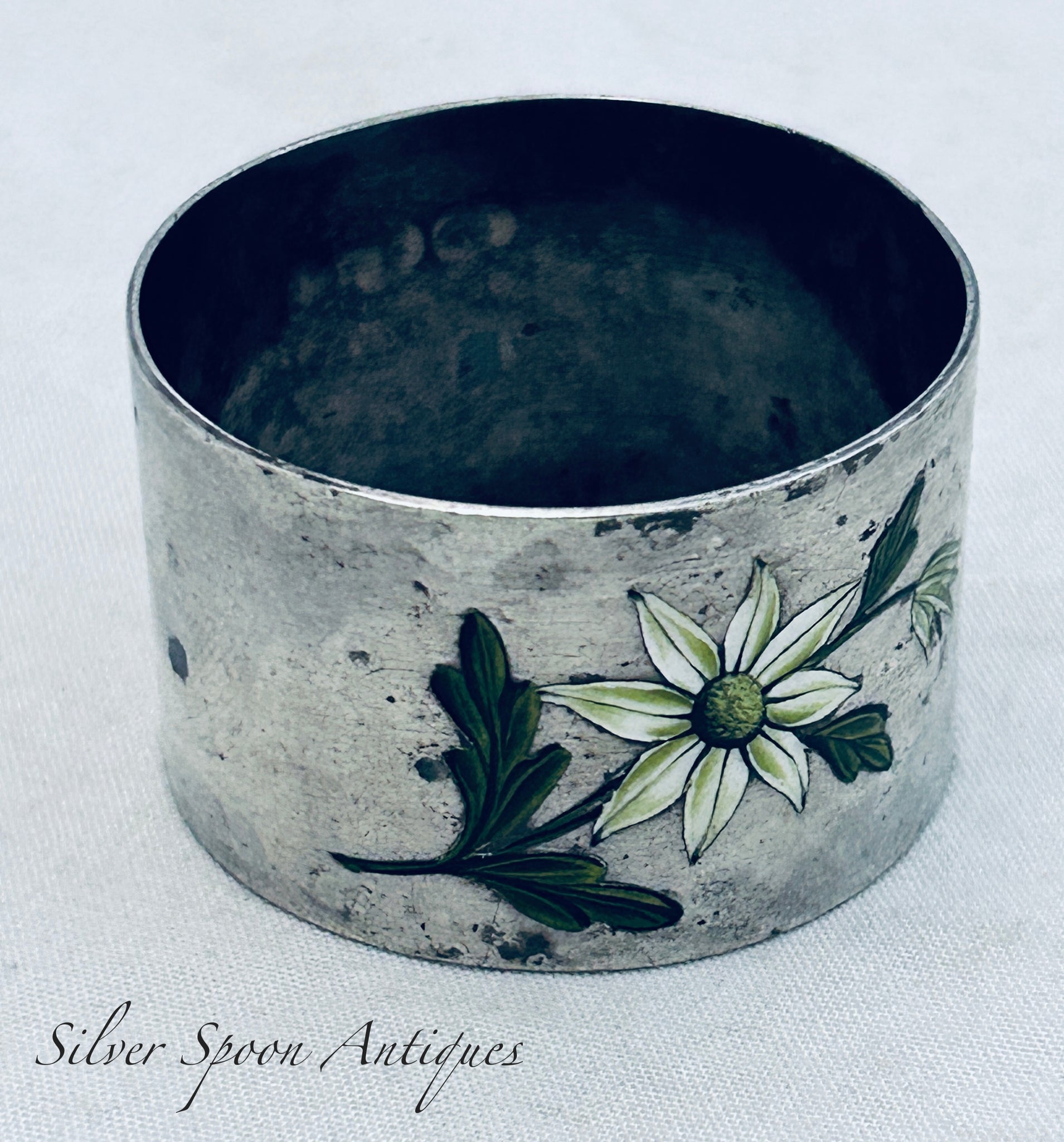 A very sweet English sterling serviette ring. It was made in Birmingham in 1915 for the Australian market and has an enamel decoration of a Flannel flower. It is monogrammed 'GRS'. It is in good uncleaned condition.