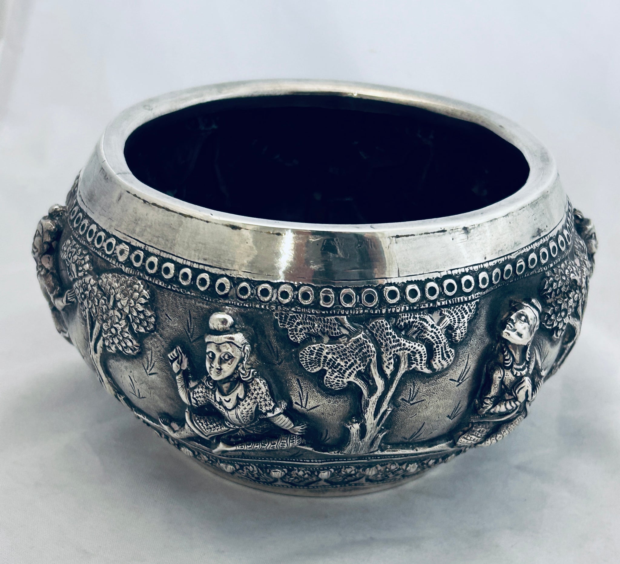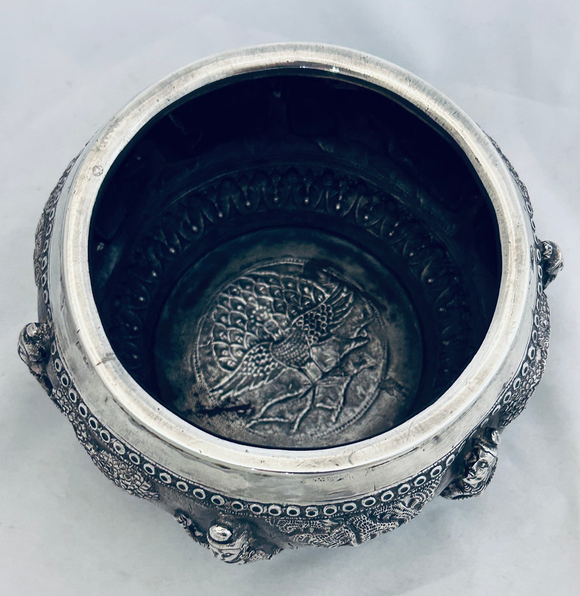 A good piece of silver, made in India or Burma in the first part of the twentieth century. It is signed on the bottom with a front facing peacock. It is in good overall condition, it is pressed in in a couple spots.