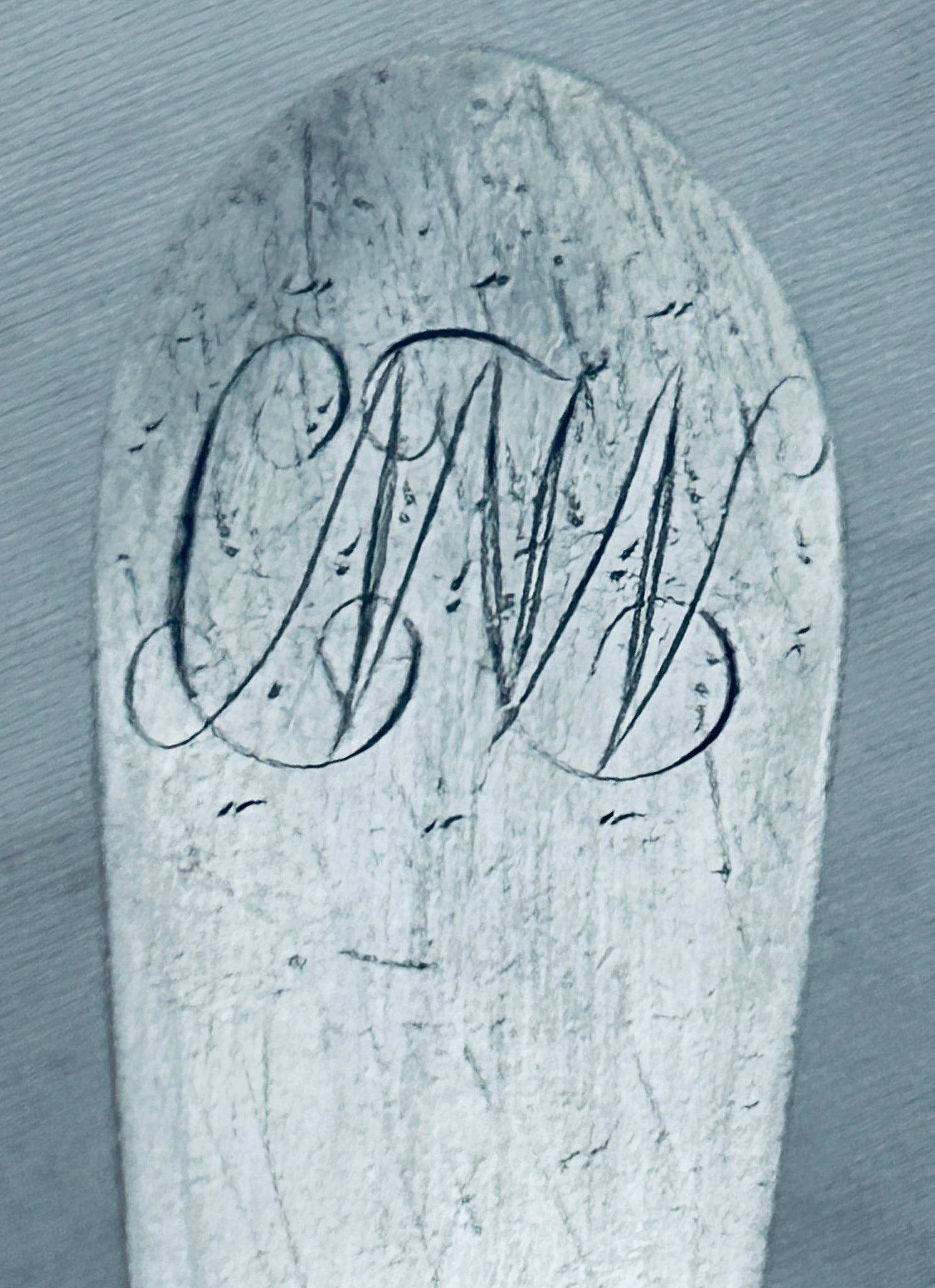 Peter Pallais was a frenchman who moved to Bermuda (via the United States) in 1787. He was an early convert to Methodism and was arrested for being part of an illegal church service. The tablespoon is monogrammed 'CMW'. It has been a bit scratched in cleaning or use and has a small ding to the bowl but is in overall fair condition.