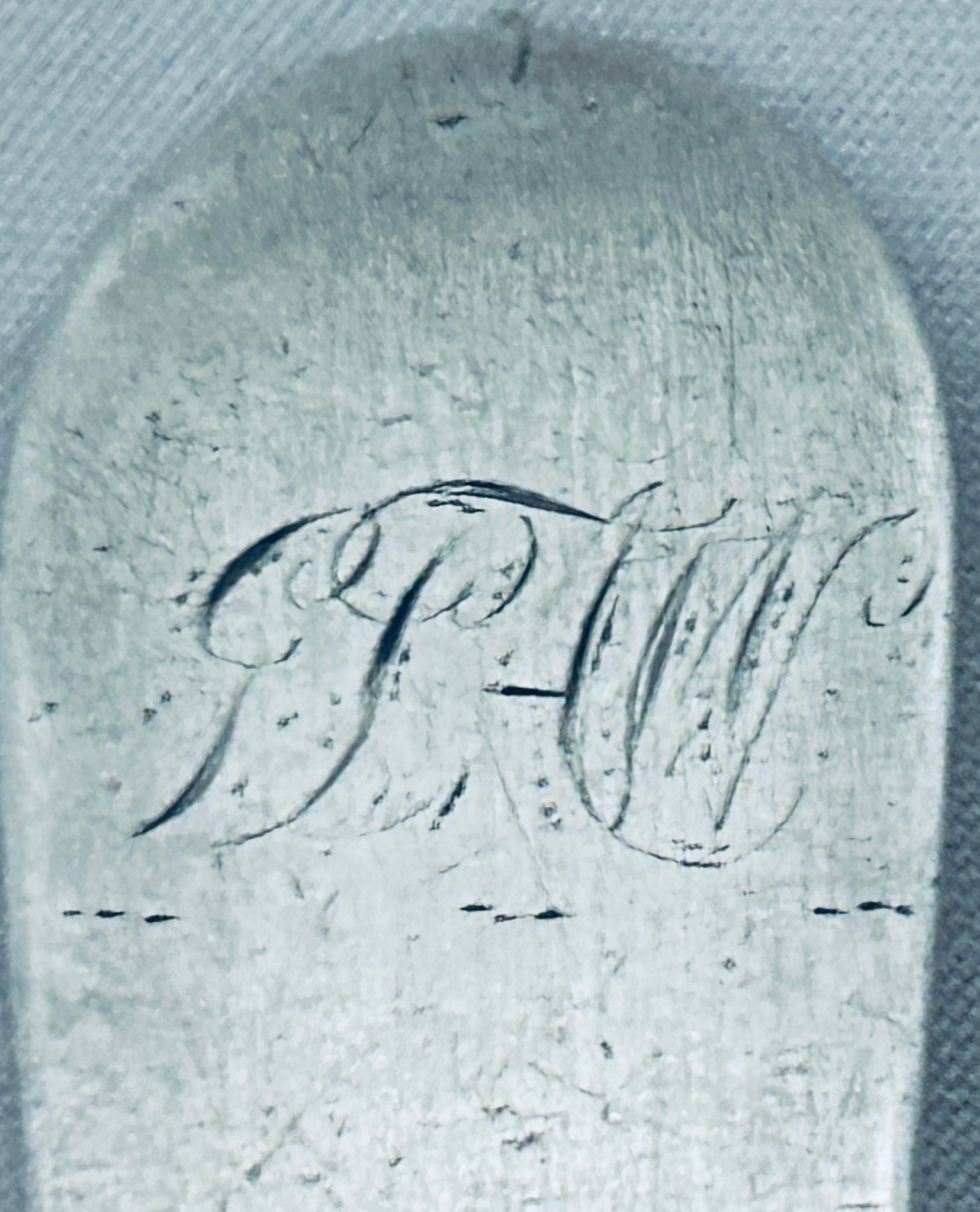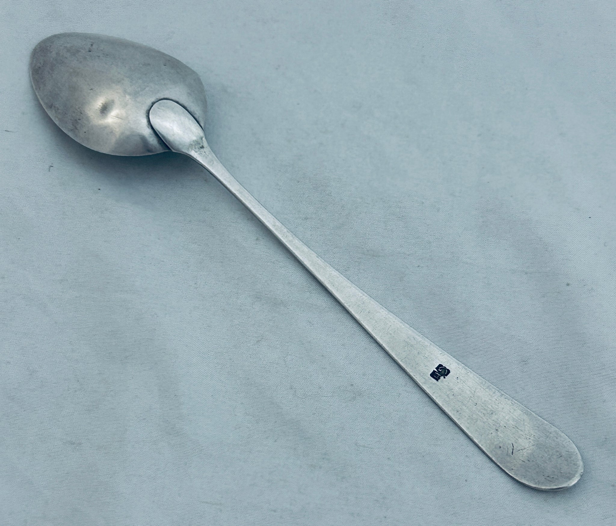 A good scarce piece of British colonial silver, this table spoon was made by George Hutchings. Hutchings worked in Bermuda in the early nineteenth century. It is monogrammed (a bit rubbed). It is in fair condition, there is some wear to the bowl.