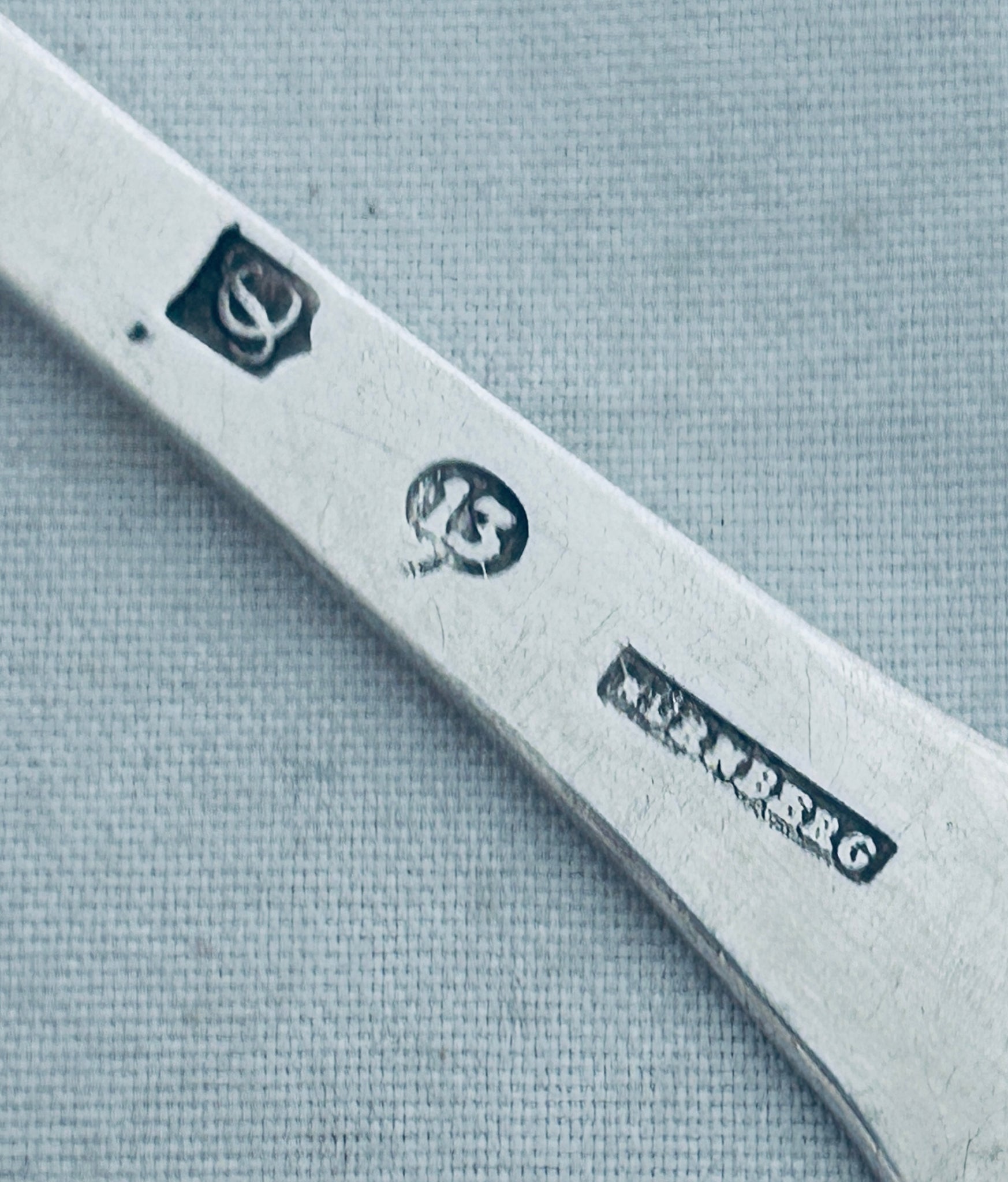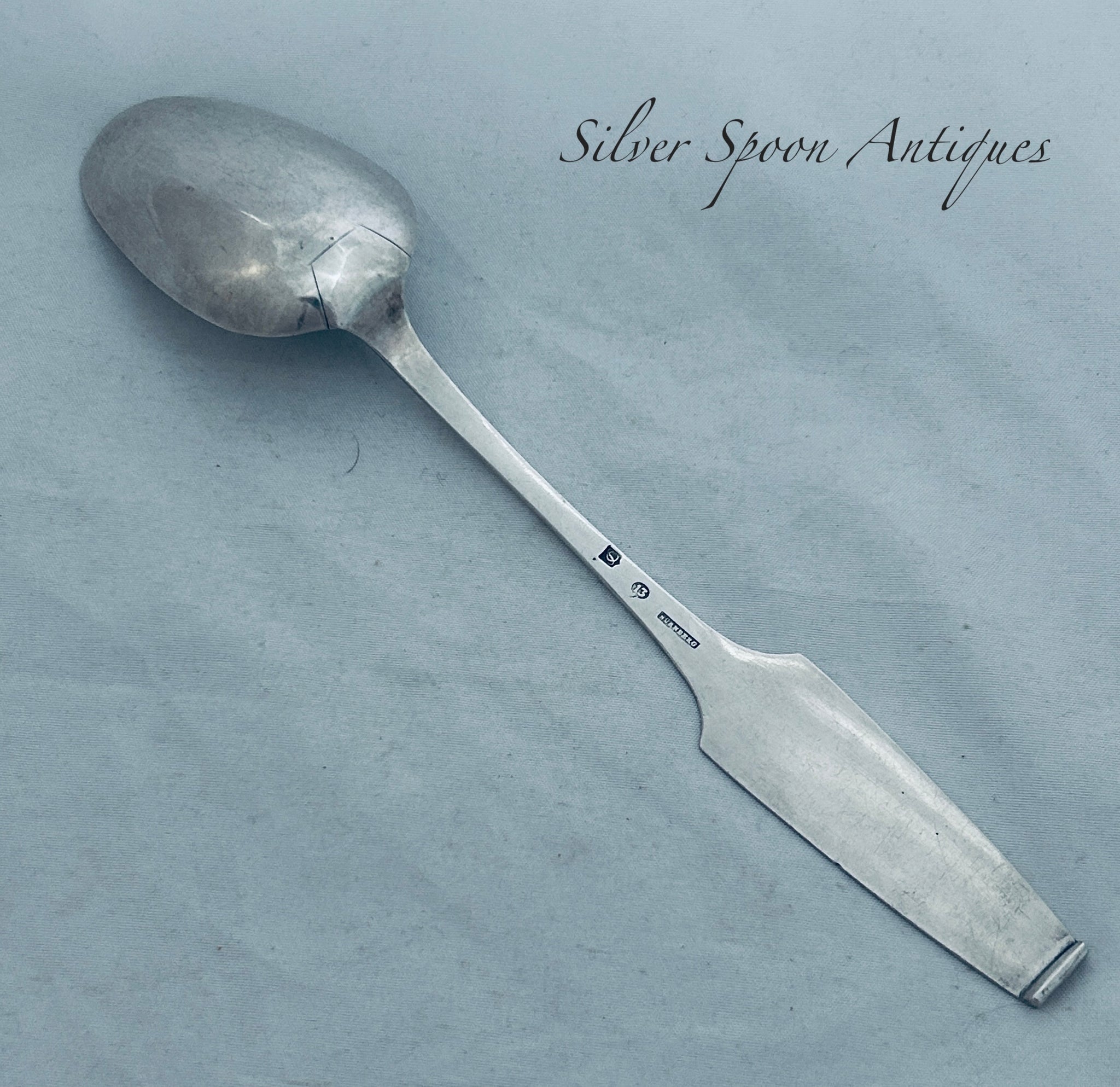 We haven't seen this style of spoon before, but it is a interesting design. A '13' stamp on silver indicates it's 81.25% pure silver, a measure of purity used in the Lothig system, used in a number of European countries in the 18th and 19th centuries. The mark represents 13/16ths of a unit of purity, which is a historical standard. It is probably German, mid-late nineteenth century. It is in great condition.