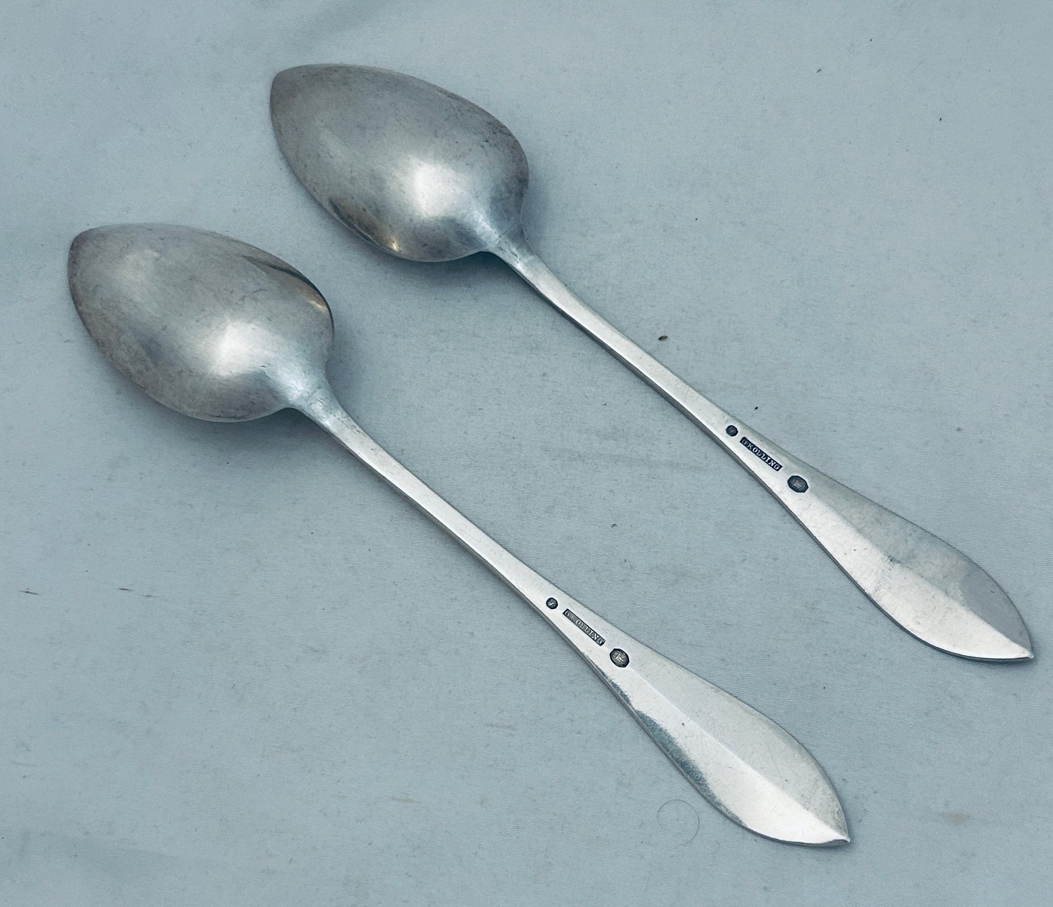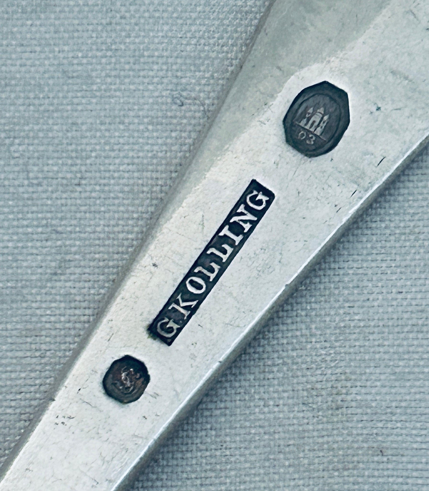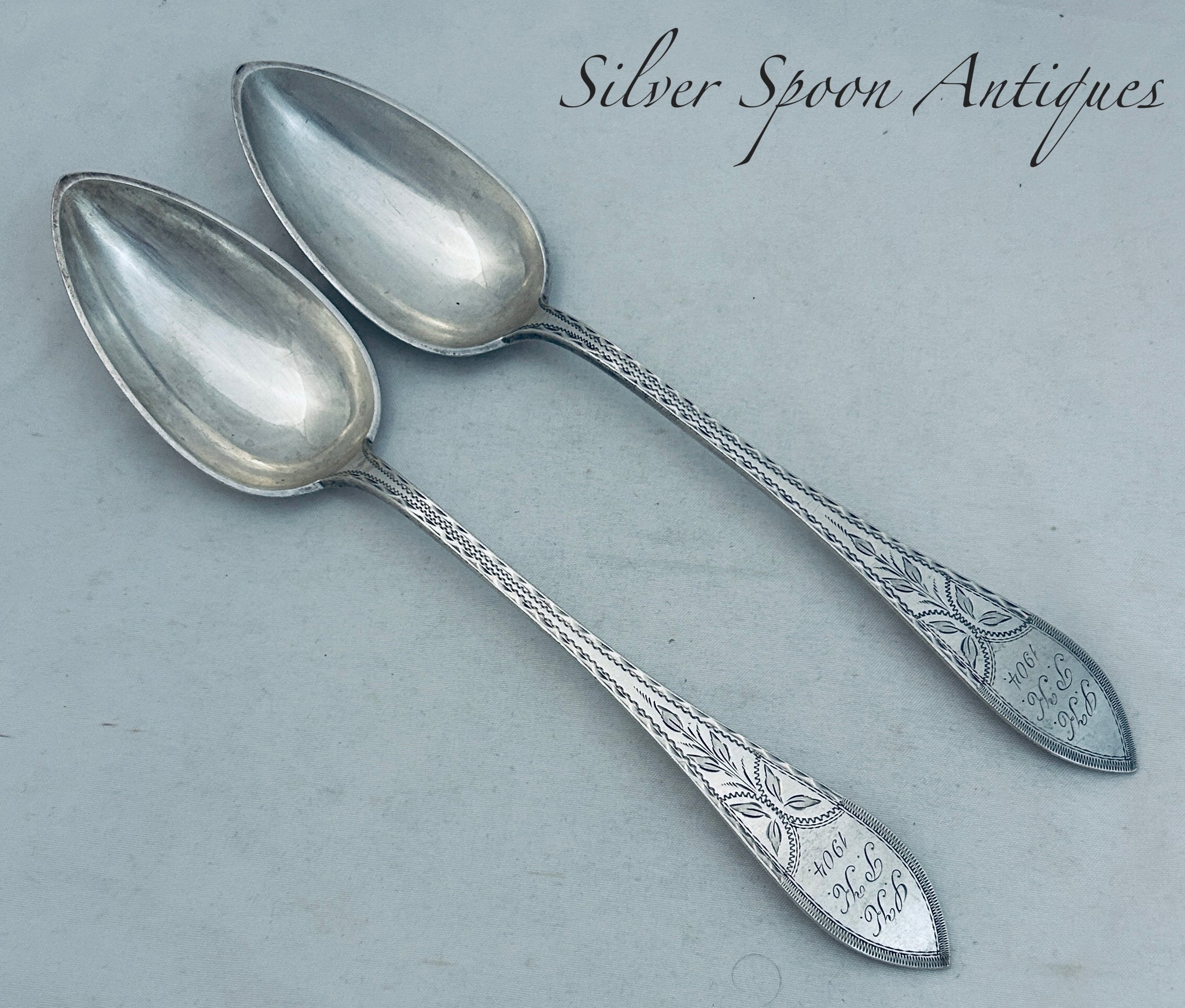 A good pair of European solid silver tablespoons. They were made by G.Kolling in Denmark in 1903. They have nice bright-cut decoration and an inscription for 1904. They are in very good condition.