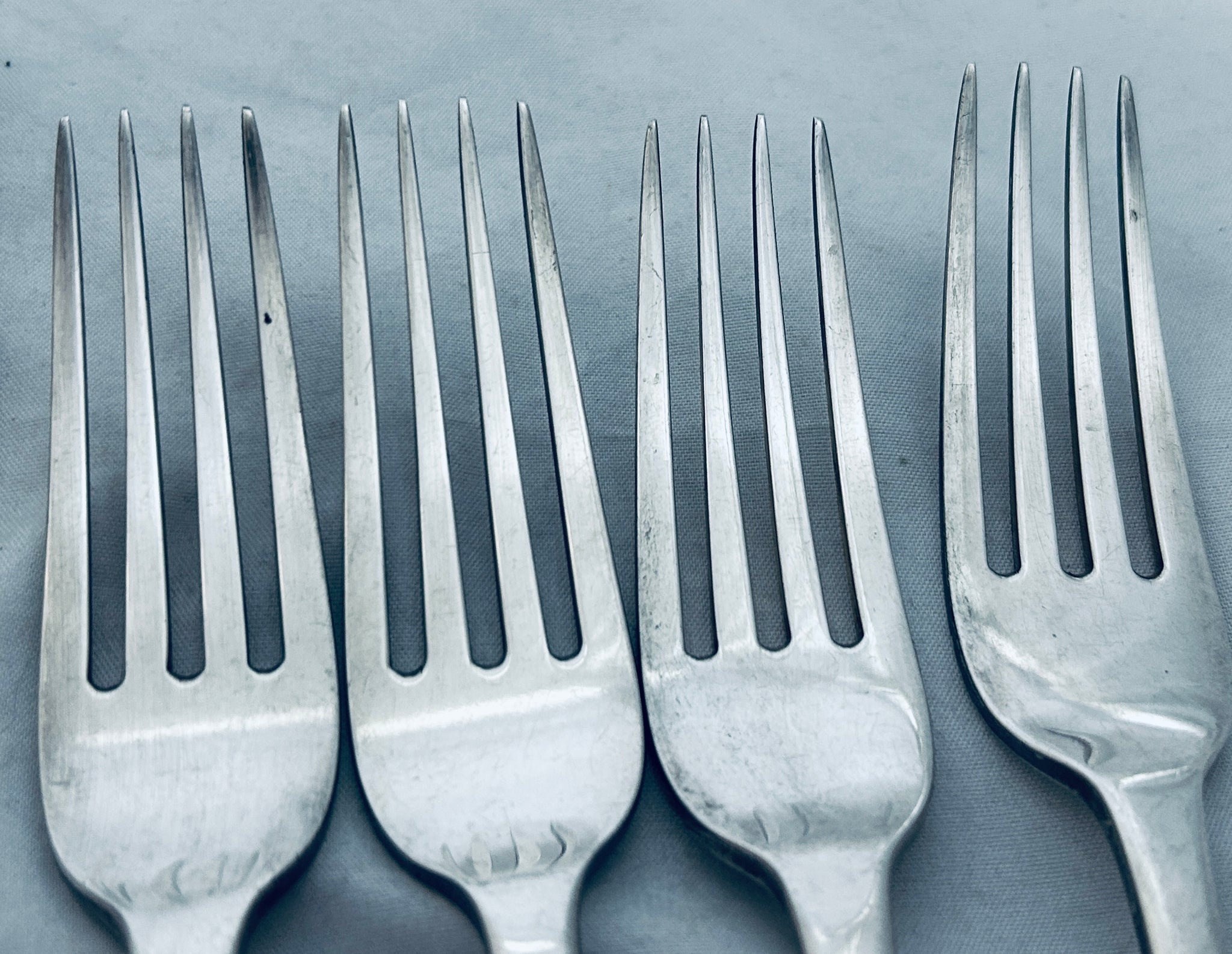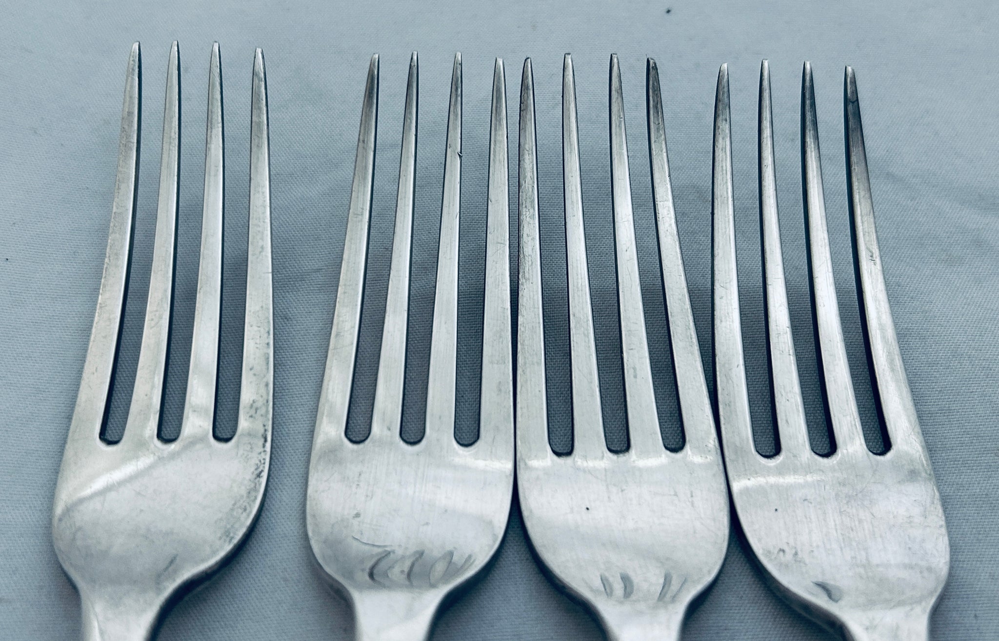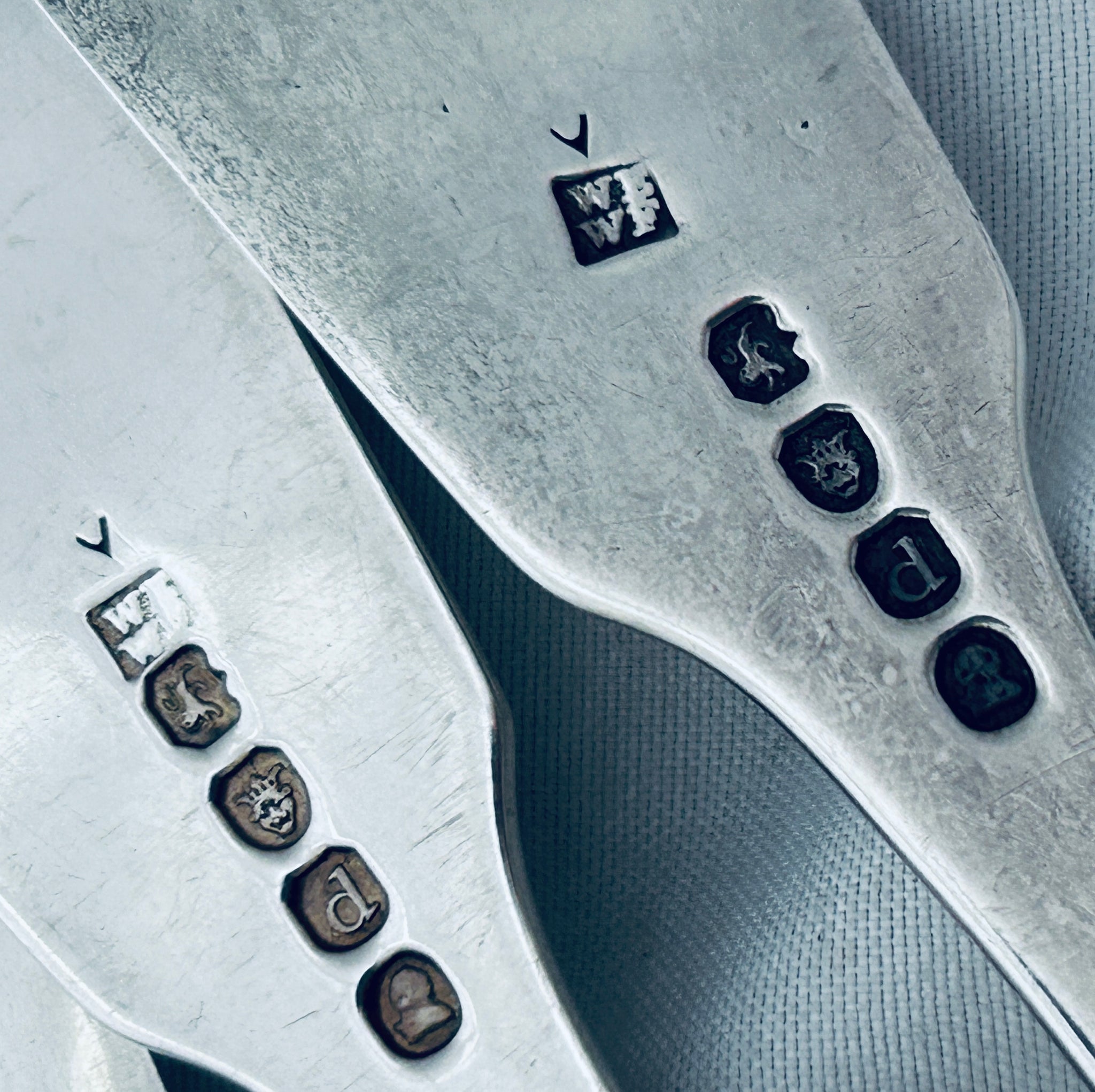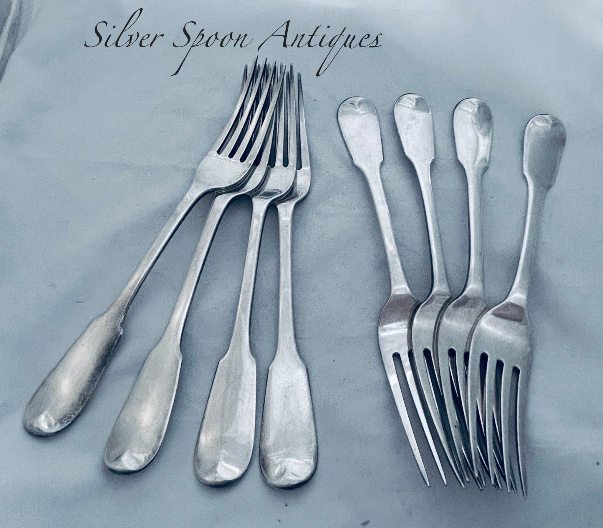 A good set of English sterling silver table forks, they were made by William Eley I & William Fearn in London in 1819. They are unmonogrammed. They are in good condition, with very little tine wear.
