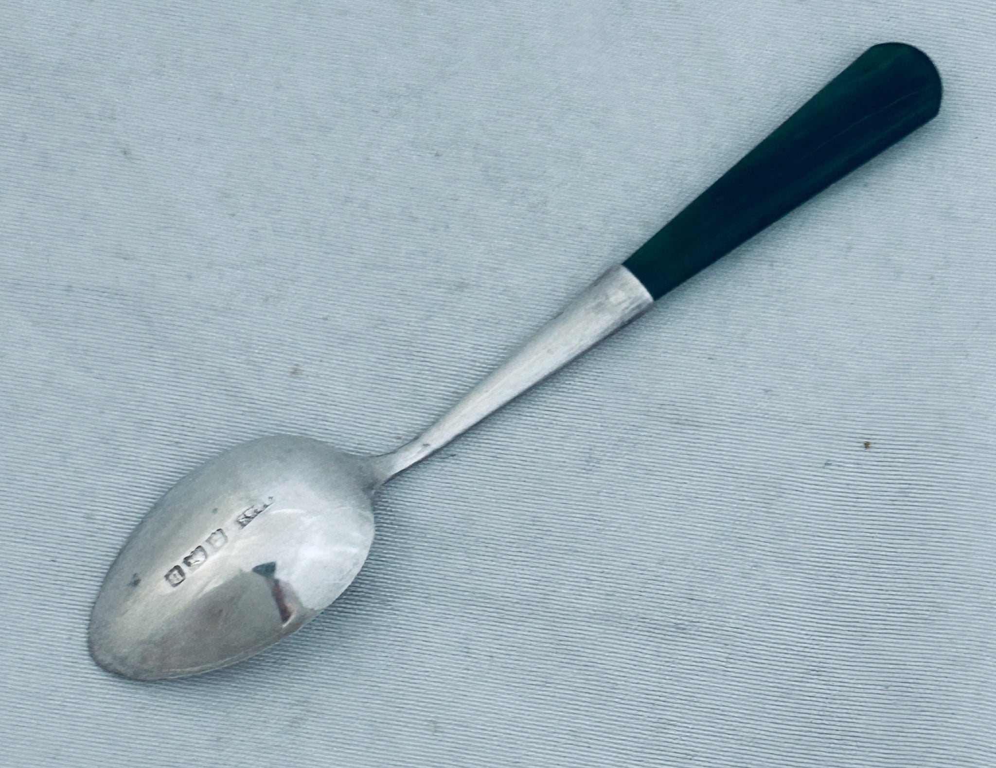 A sweet little spoon, probably originally part of a set. It has a greenstone handle and sterling silver bowl. It was made in Birmingham in 1926. It is in good overall condition.