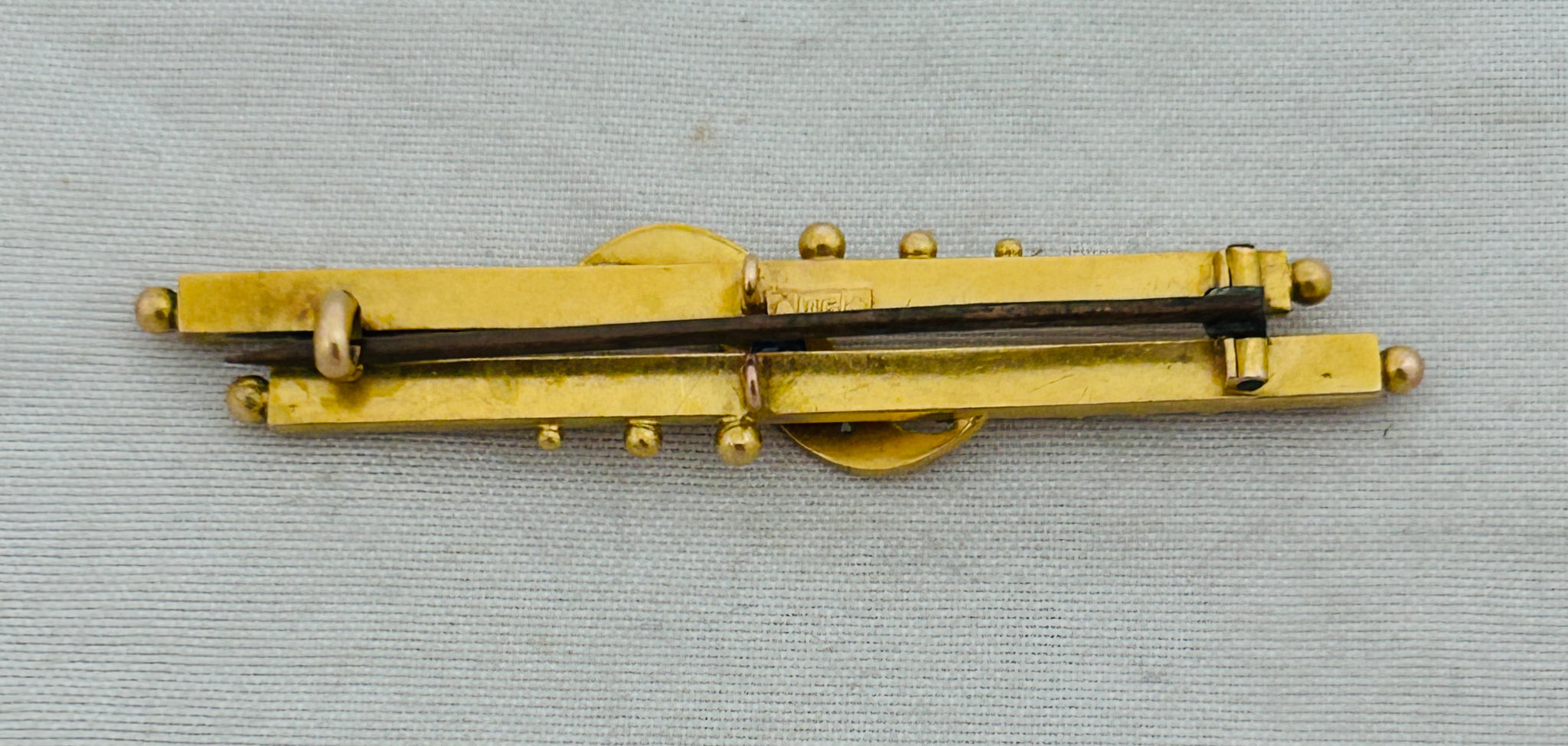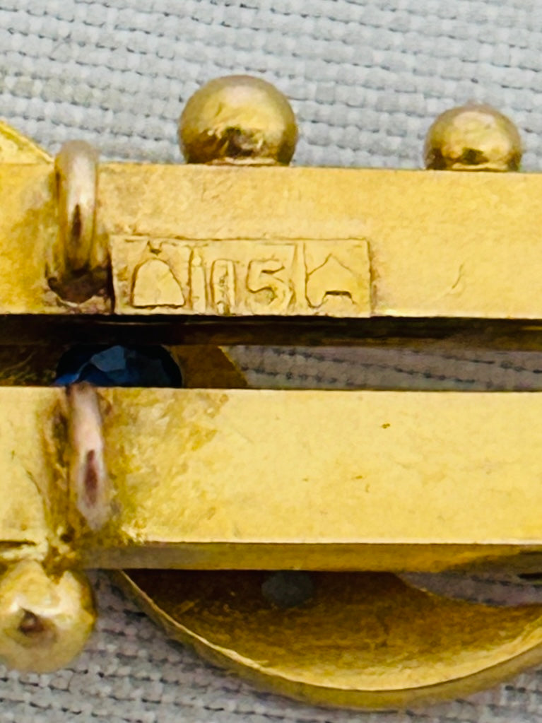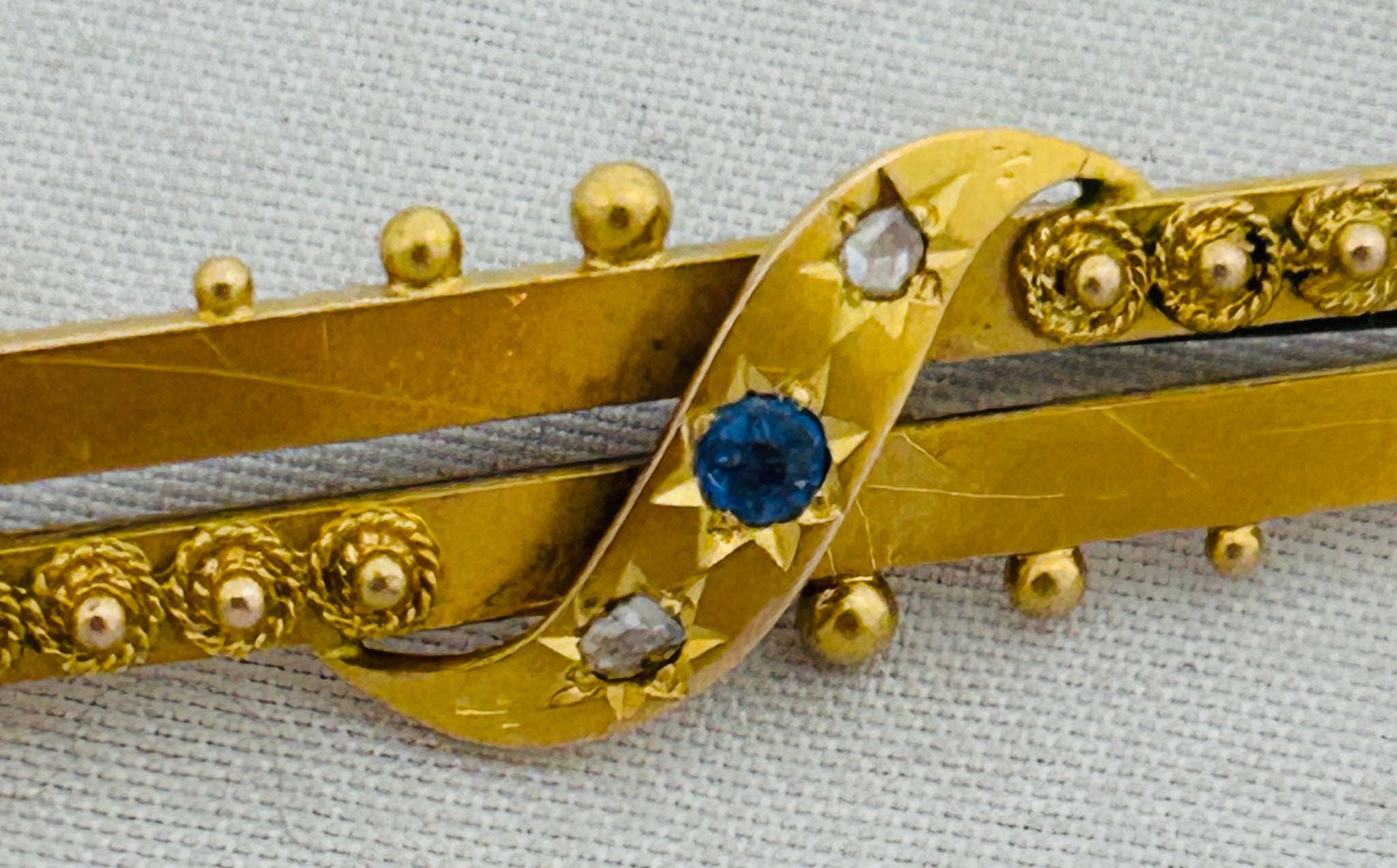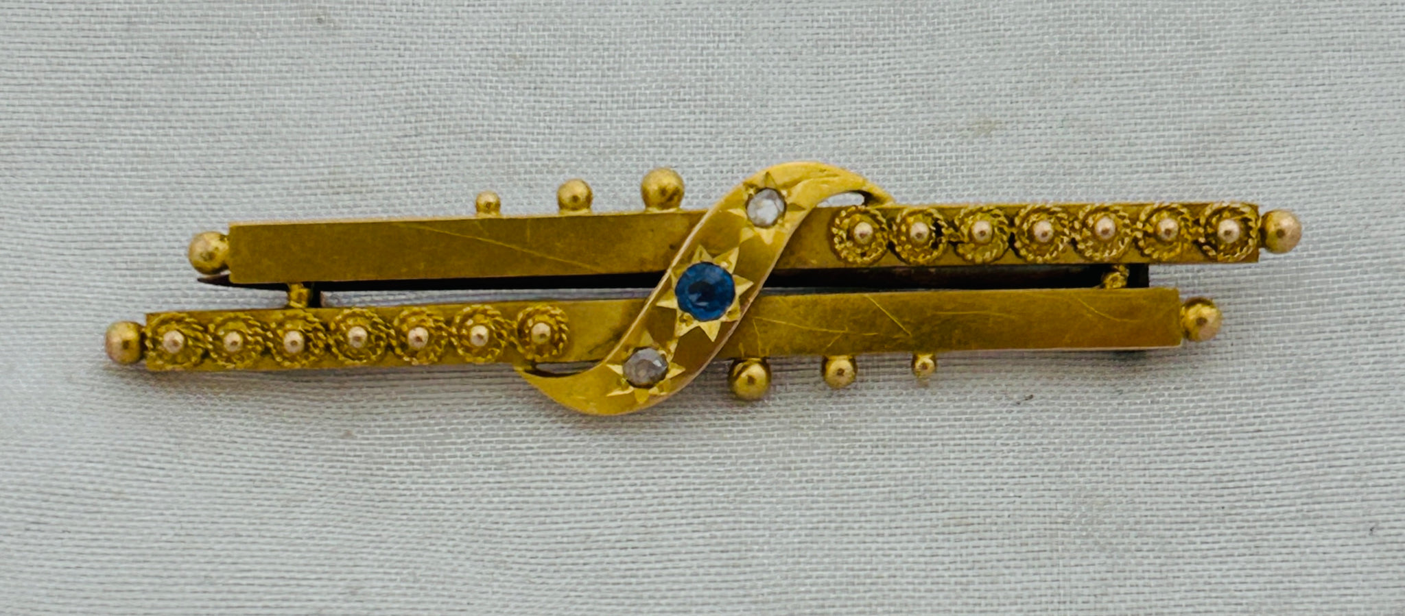 A beautiful Australian made brooch, it includes one Ceylon sapphire and two rose cut diamonds. It was made by RH Parker in Melbourne. Robert Parker arrived in Australia from England in 1874 and set-up the following year. He owned the business unitl his death in 1932 before it was taken over by his sons. This brooch is illustrated in the well known reference book 'Australian Jewellers: Gold and Silversmiths Makers and Marks' on page 184. It is in good overall condition.