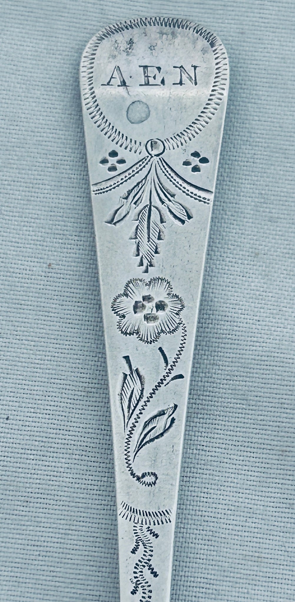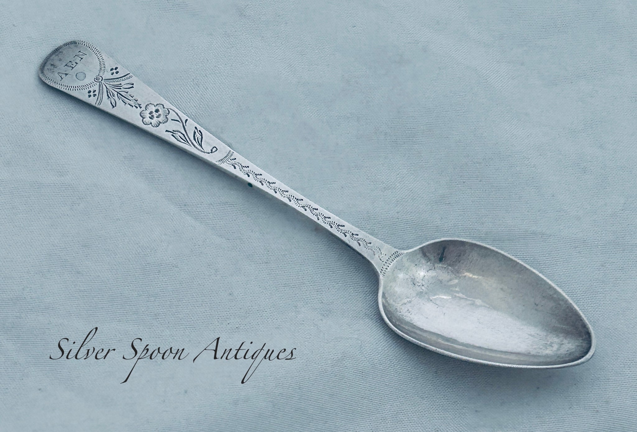 Following the death of his partner Thomas De Gruchy in 1846, John Le Gallais continued with the business alone. He was likely to be the last of the Jersey spoonmakers, but many of the spoons that he sold were the work of English silversmiths with a 'JLG' overstriking that of the original maker. John Le Gallais was in business until 1873. The business was continued by H. Hollinshed. This teaspoon bears his personal stamps for the pieces made in his workshop. It has good bright-cut decoration and is monogrammed 'AEN'. It is in good condition.