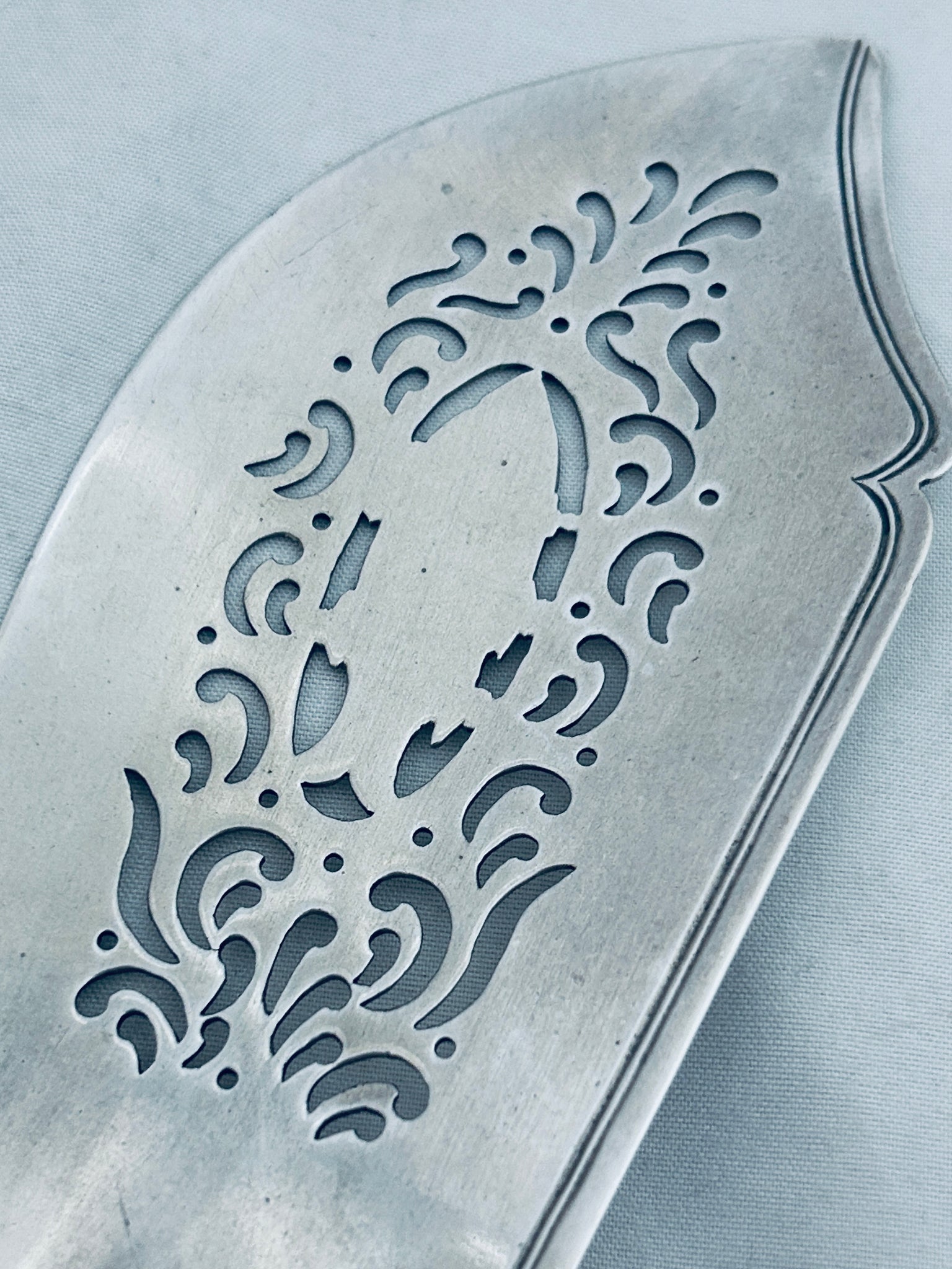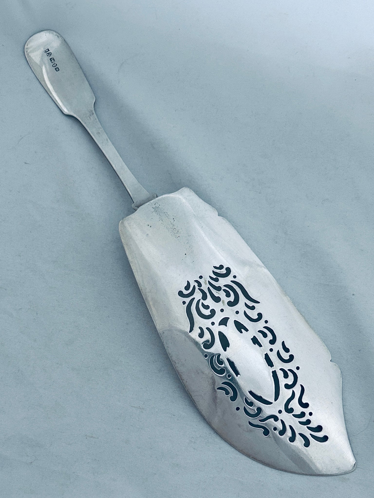 A good sterling silver fish slice/server, this example was made in Newcastle by John Walton in 1835. It is in the fiddle and shell pattern with nice reeding and pierced decoration on the blade, including a fish. It is monogrammed 'T G J C'. In good overall condition.