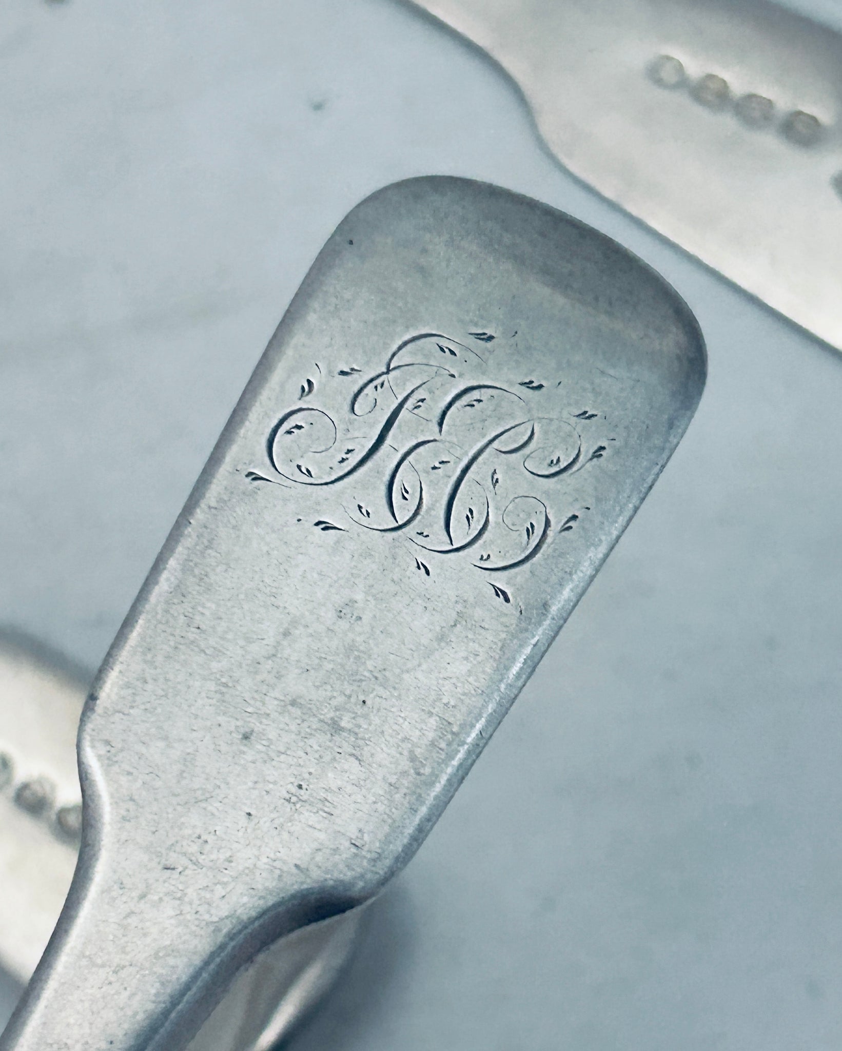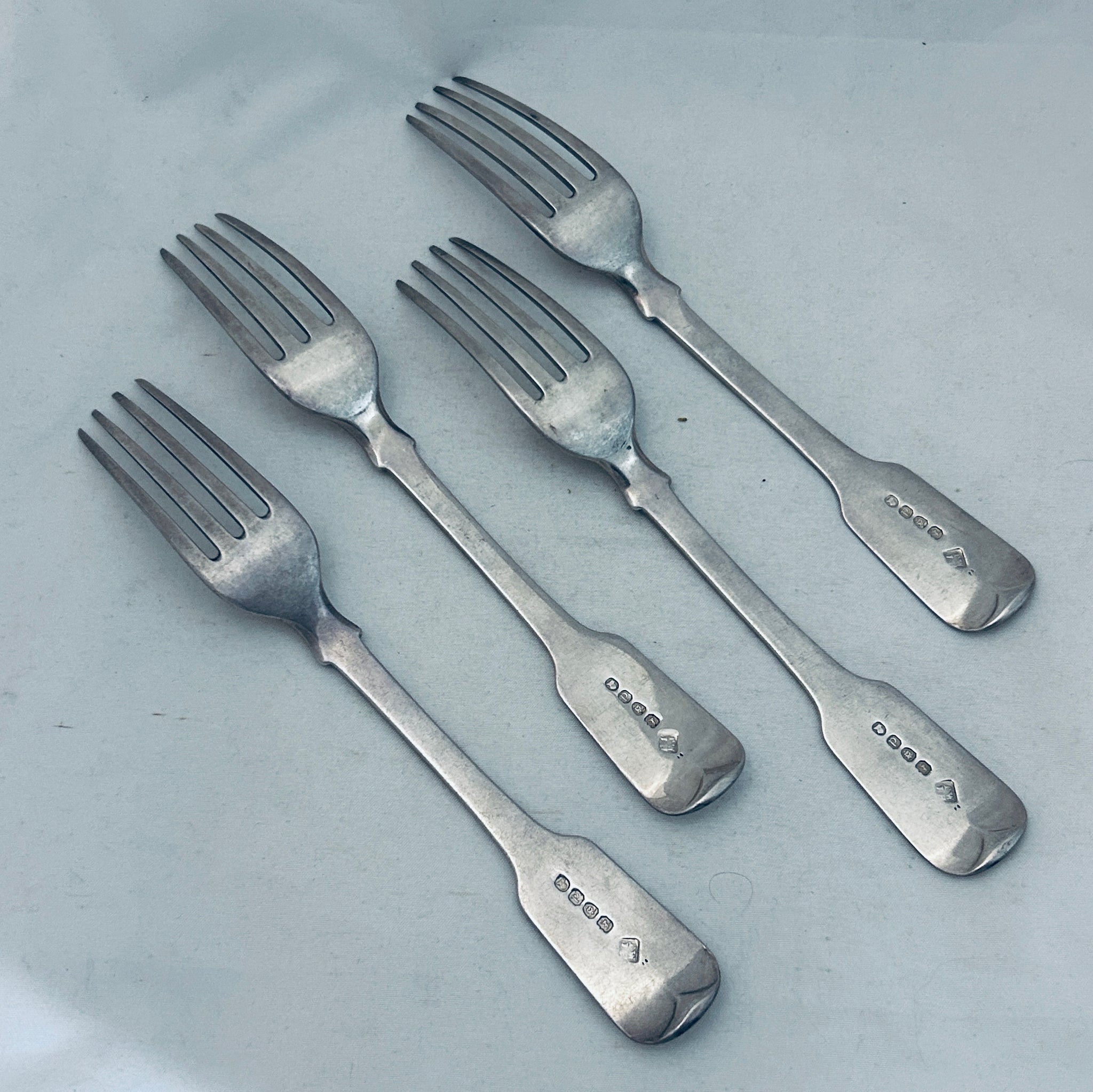 A good solid set of four English solid silver table forks. They were made in London by Thomas Wallis (II) & Jonathan Hayne in 1819. They are monogrammed 'JEC' and are in good overall condition, with some tine wear.