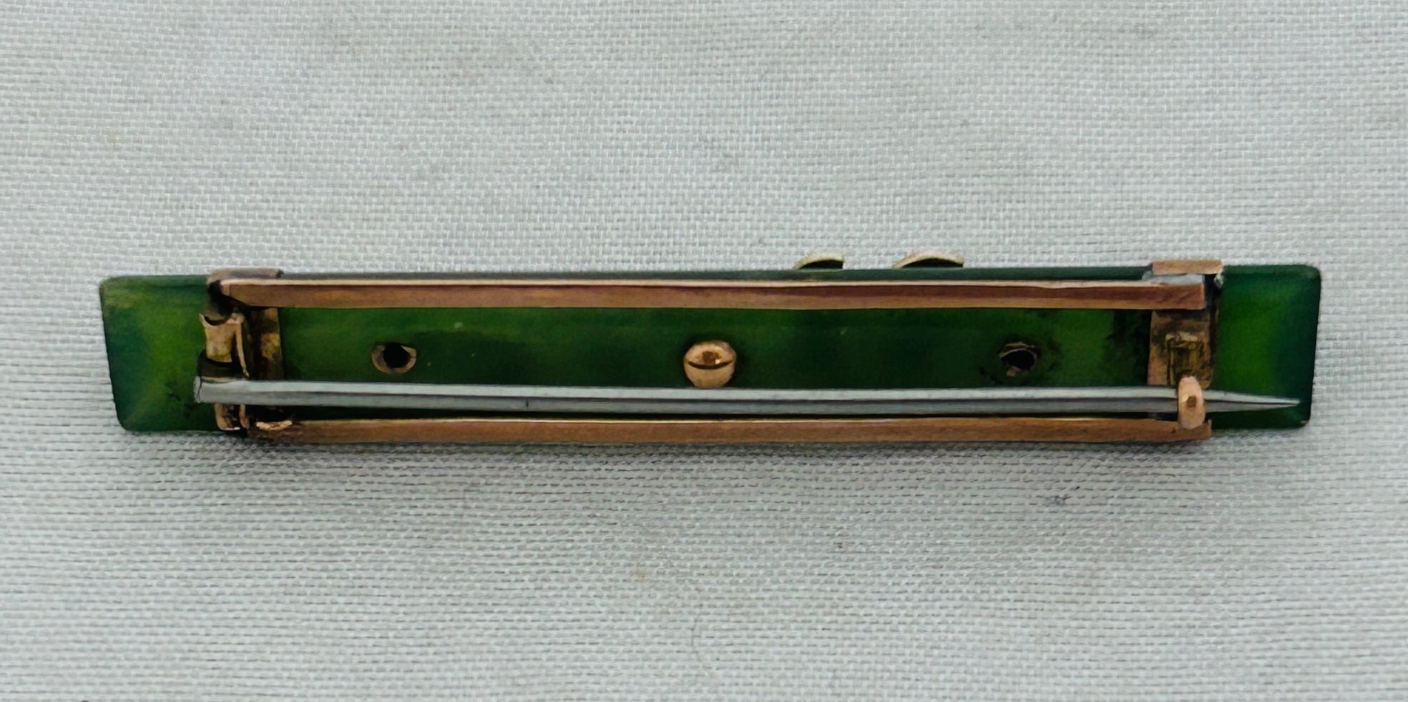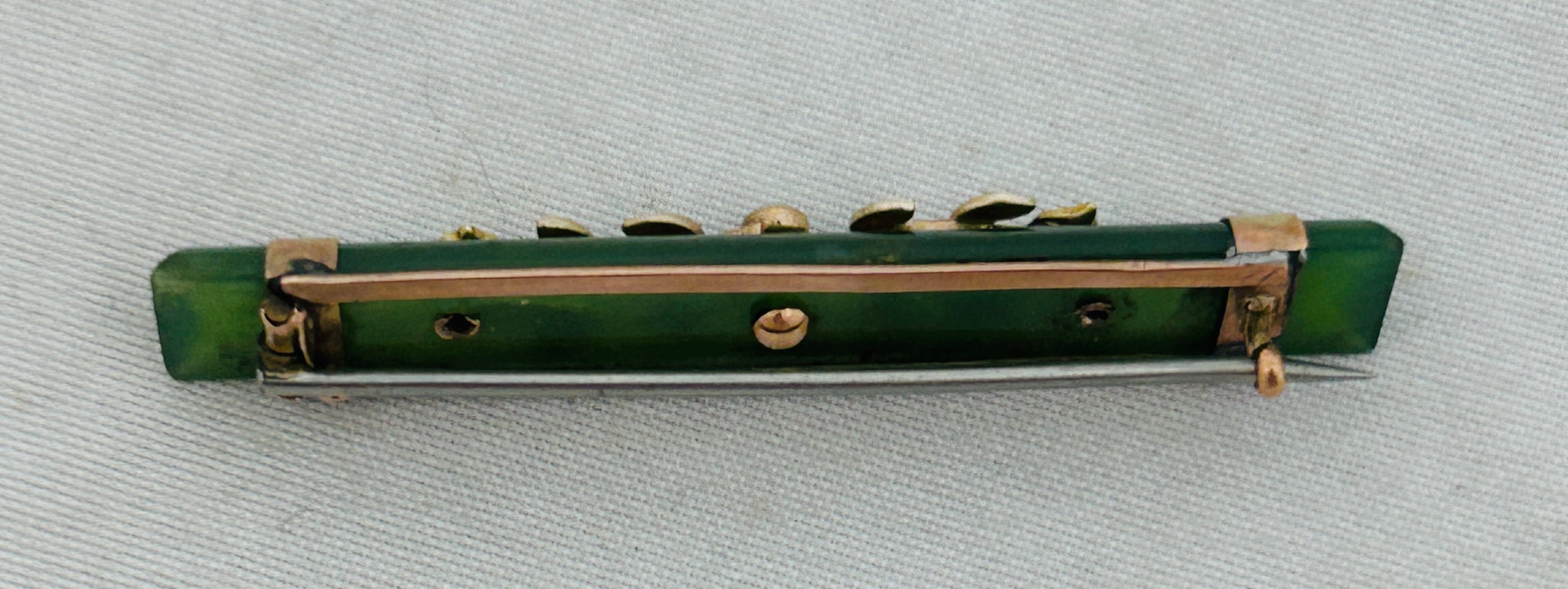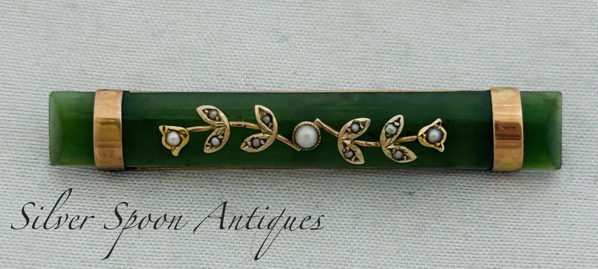 A sweet little brooch, it is made up of greenstone set with gold and some seed pearls in a floral decoration. It is in good condition.