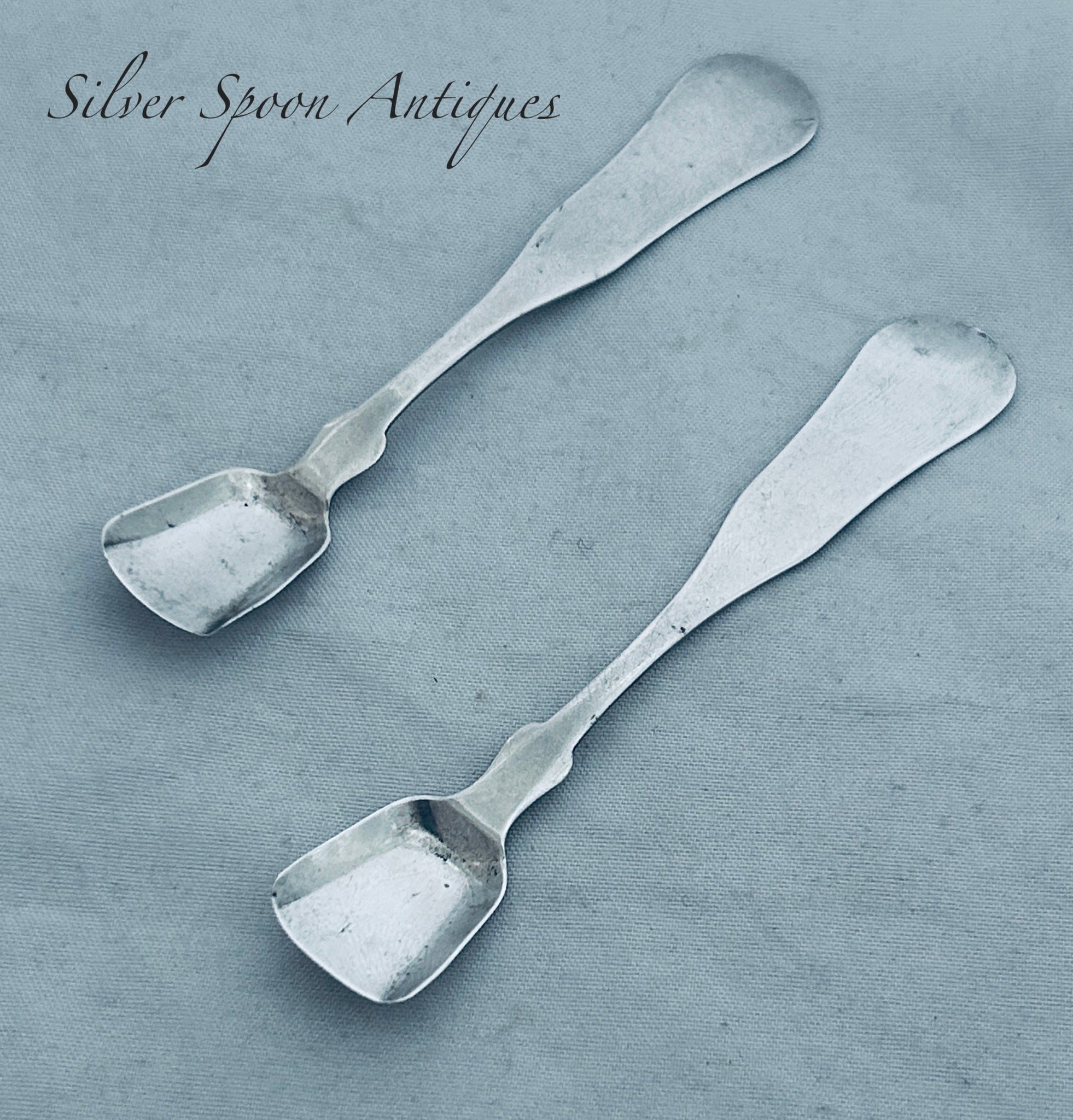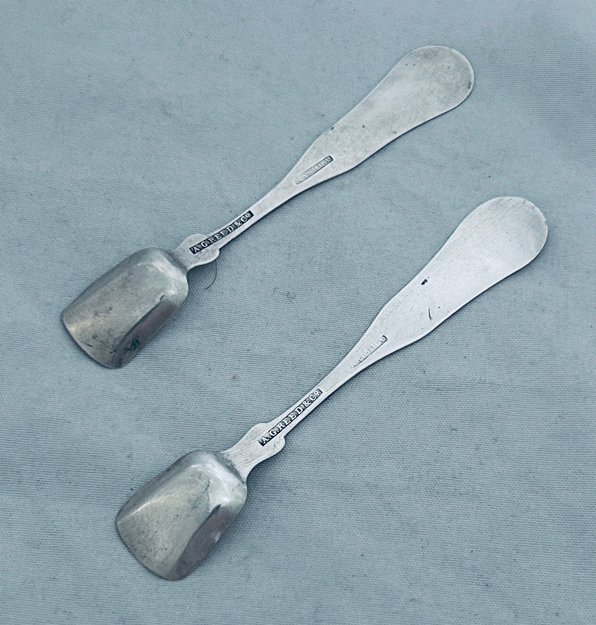 This pair of American coin silver salt spoons/shovels were made by AG Reed and Co in Nashua New Hampshire. Augustus Gardner Reed was in this partnership between 1843 and 1849. They are in good condition.