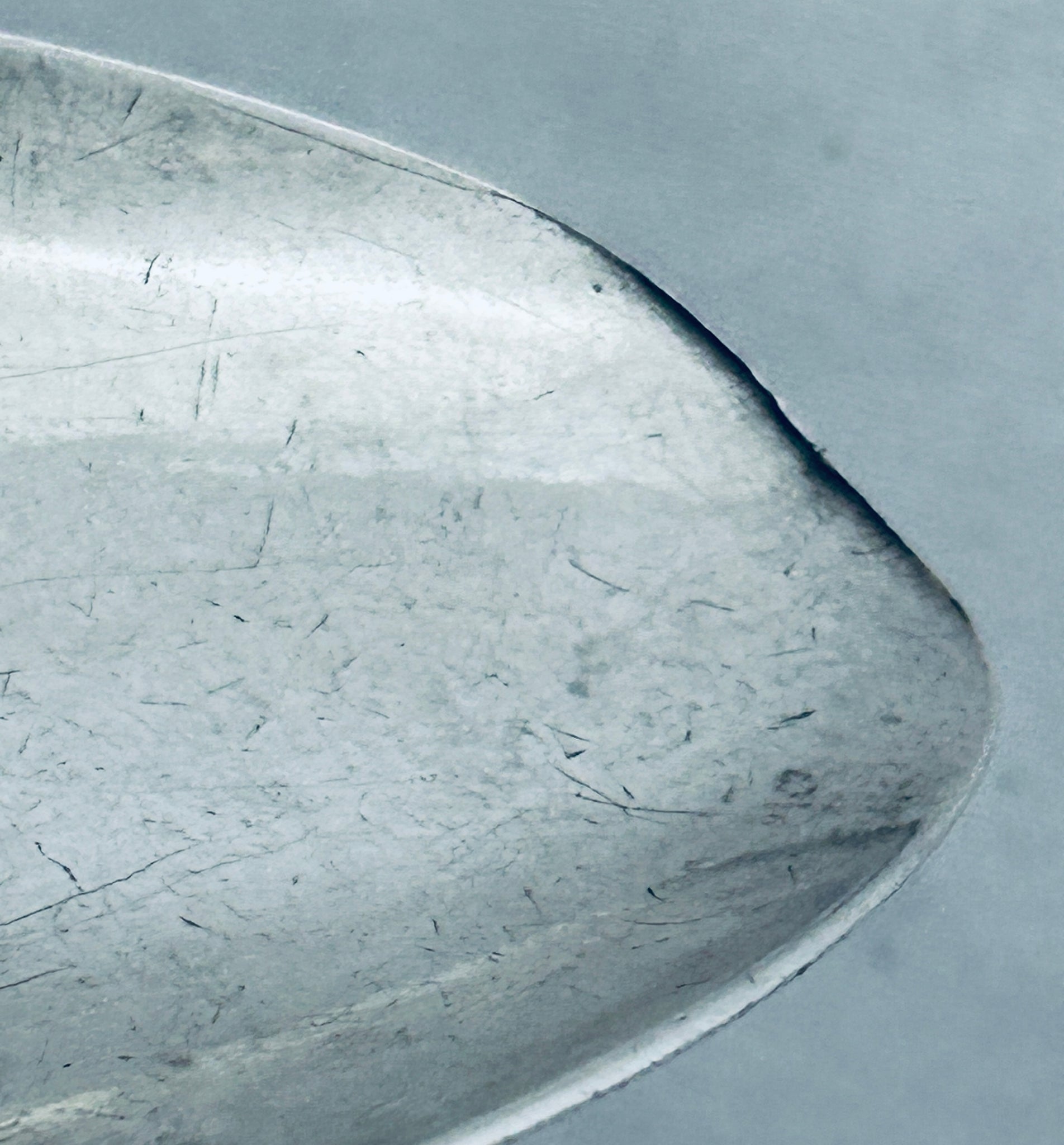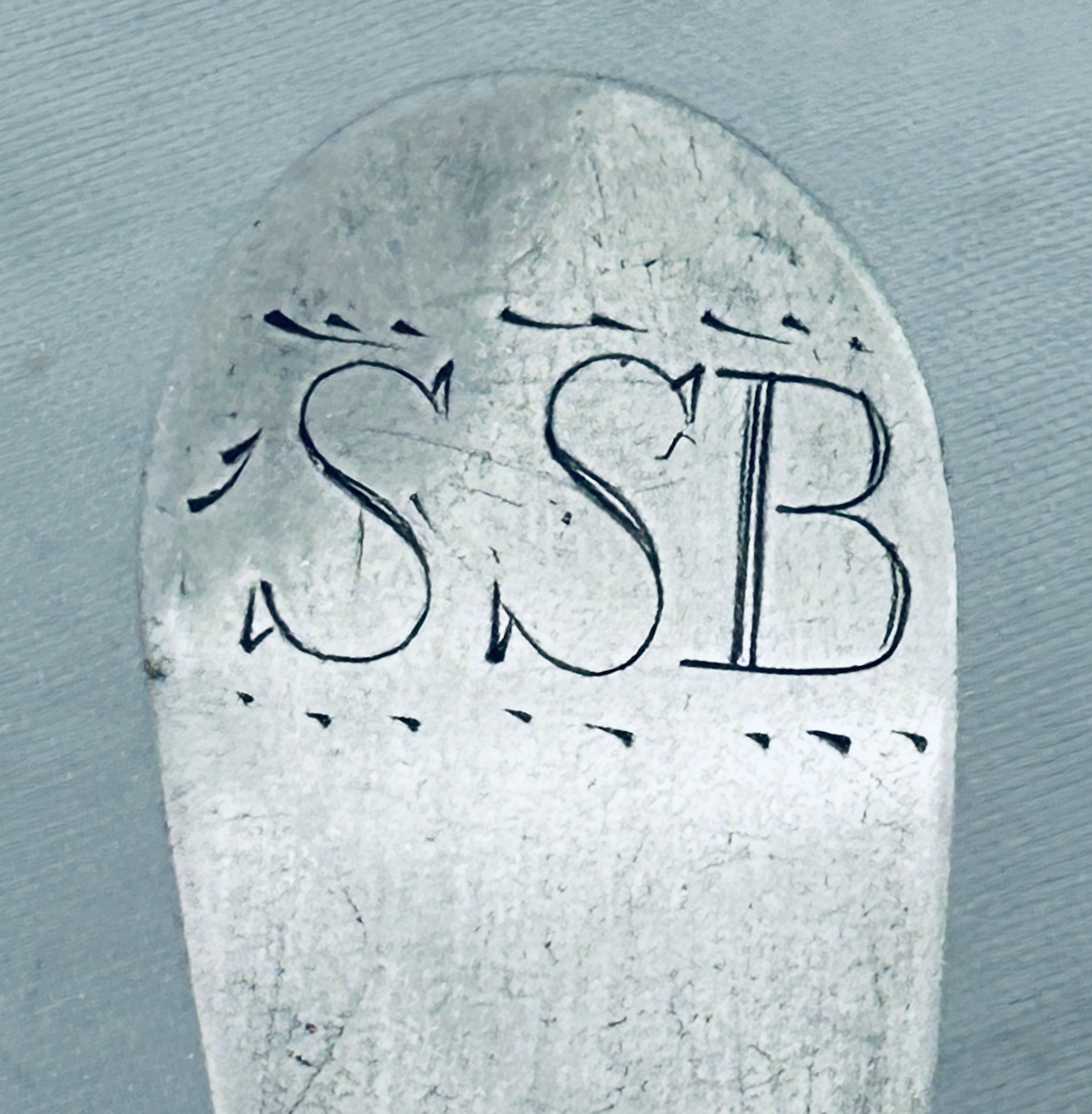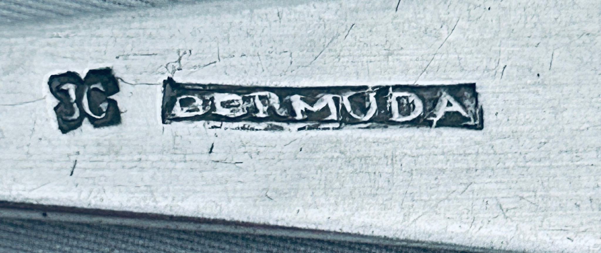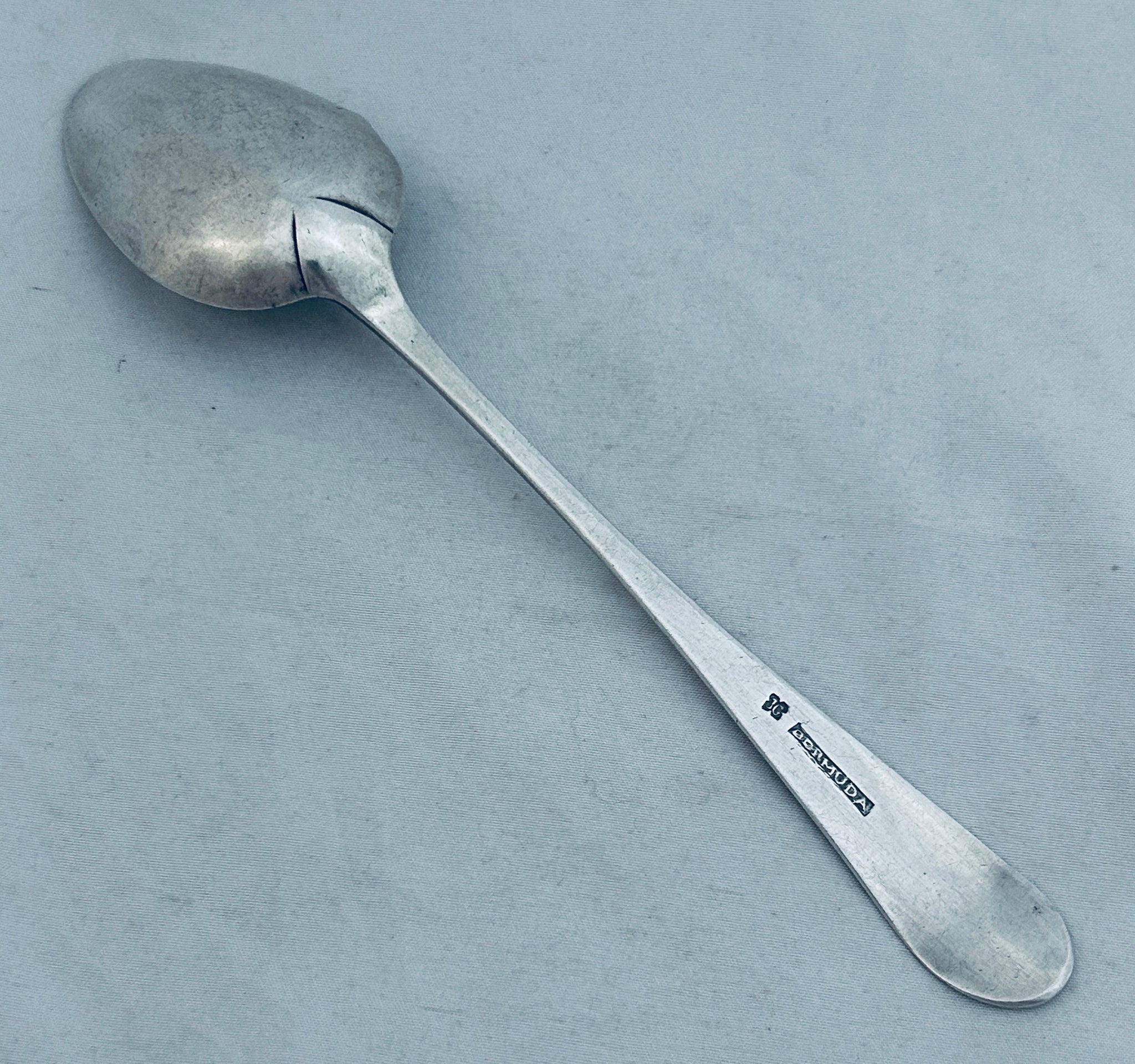 There is a lot to make this spoon rare, even among Bermudan silver. Firstly it was made by Joseph Gwynn, a man who would end up being hung for murder in 1826 on the island. Secondly, as well as his maker's mark, it is also stamped 'Bermuda', only one other maker was known stamp his silver with the location. This spoon is monogrammed 'SSB' in colonial script. It is in fair condition, there is a split to the bowl and some bowl wear.