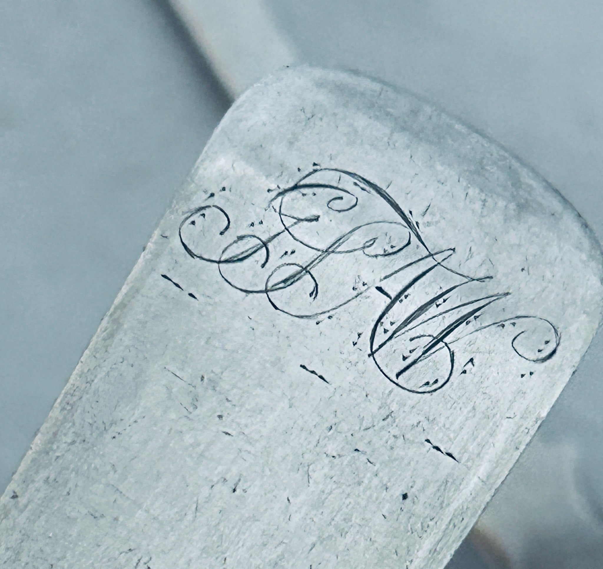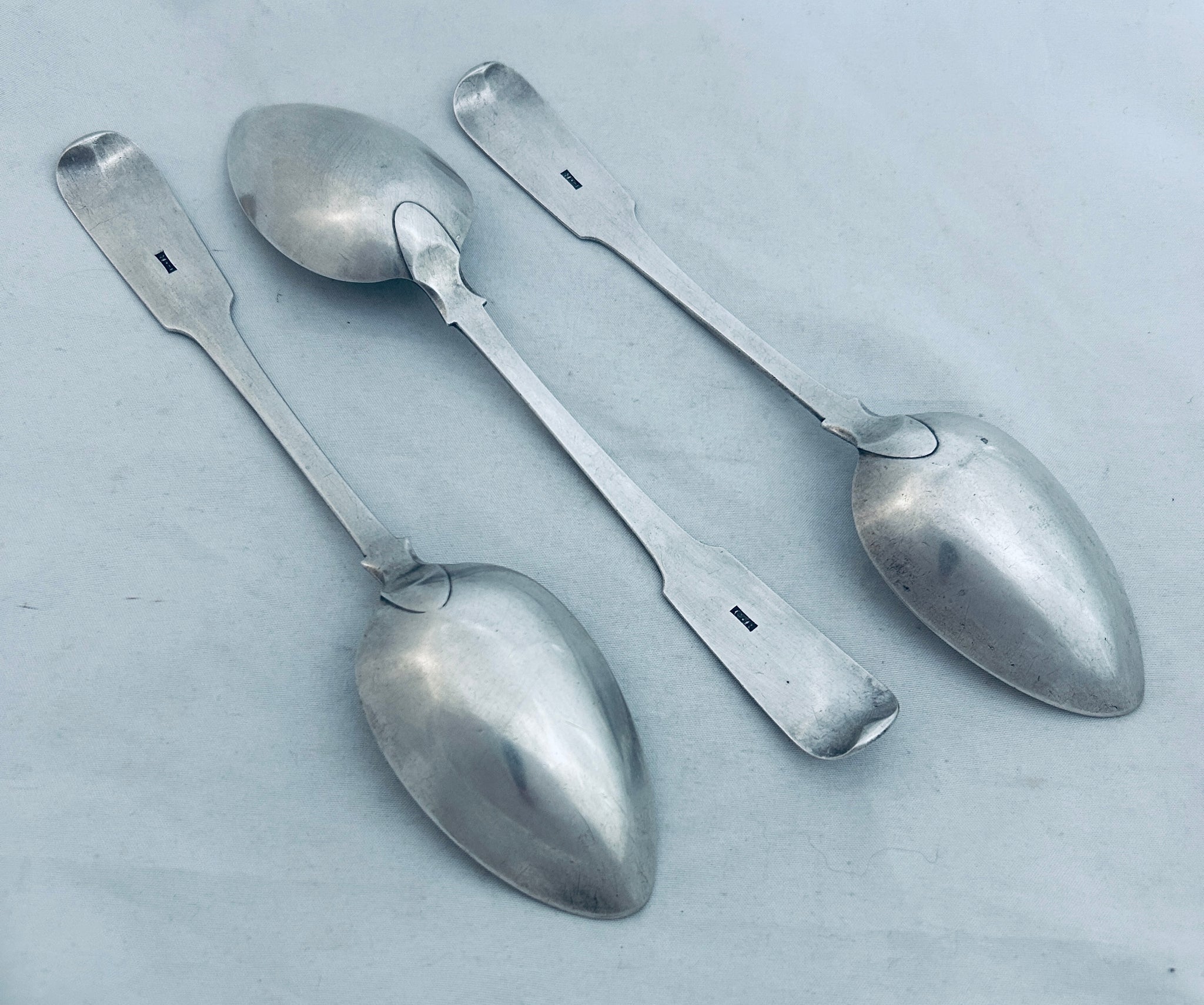 A rare set of Bermuda silver. These three fiddle pattern tablespoons were made by George Rankin. Rankin was one of the last of the Bermudan silversmiths. He was the son of a sea captain and was sent off to England to complete his silversmith apprenticeship. They are monogrammed 'GSAW'. In very good condition, ever so slight bowl wear.