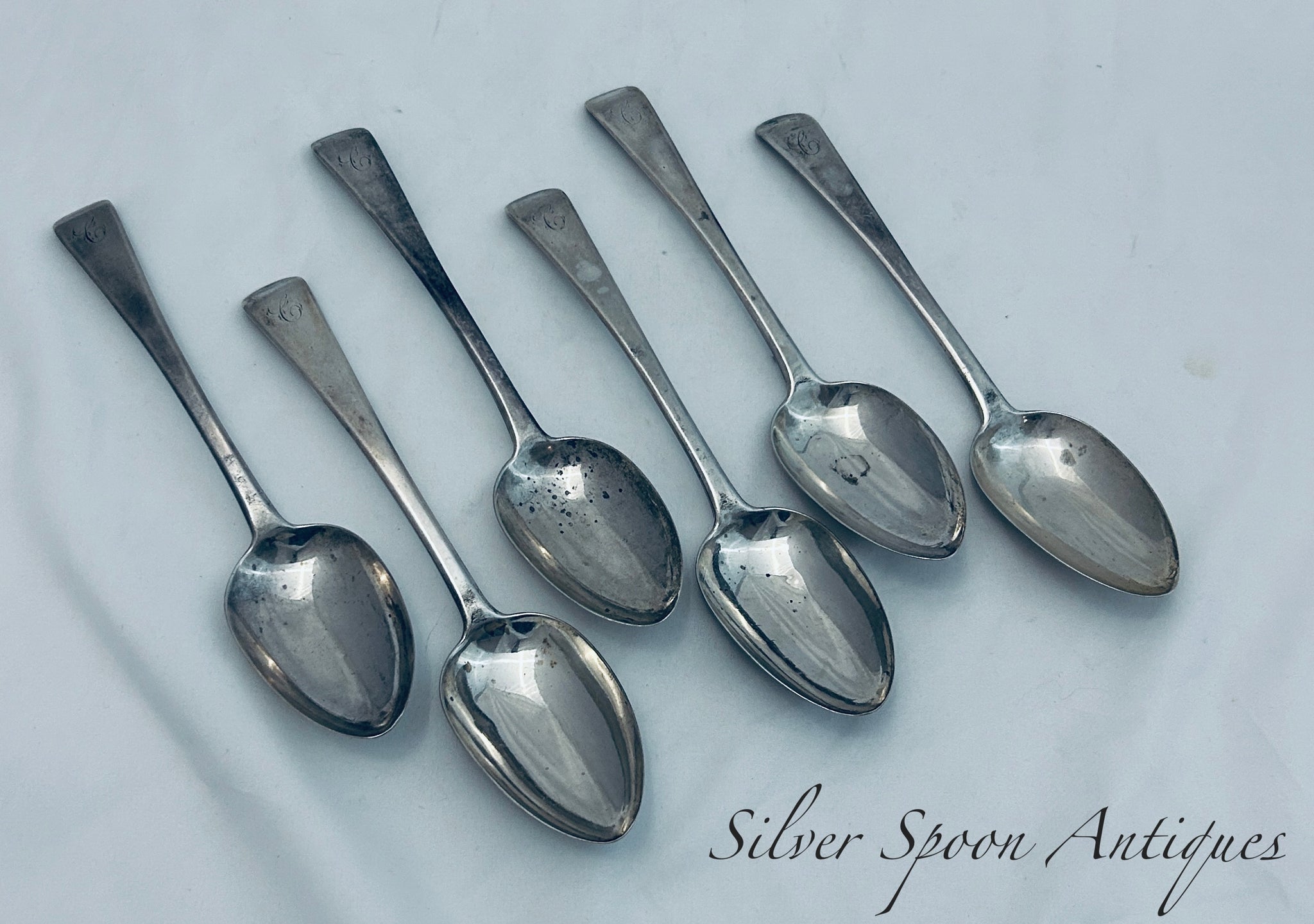 A good set of six English sterling silver tablespoons in the Old English pattern. They were made in London in 1817 by Thomas Wallis (II) & Jonathan Hayne. They are monogrammed 'C' and are in good condition.