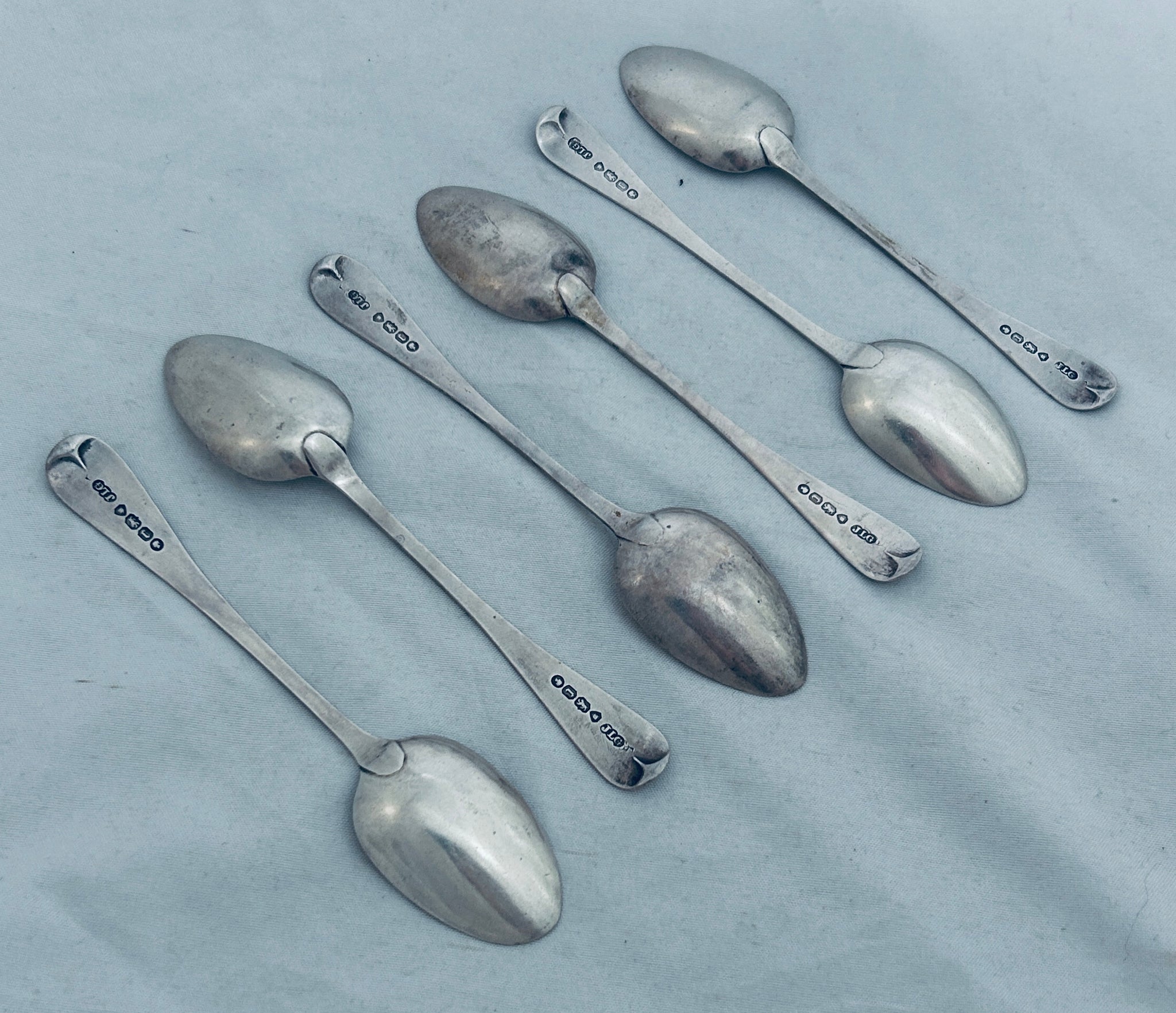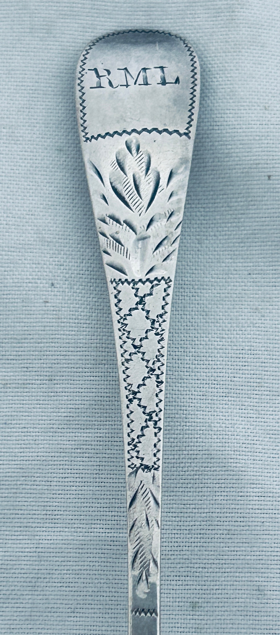 Following the death of his partner Thomas De Gruchy in 1846, John Le Gallais continued with the business alone. He was likely to be the last of the Jersey spoonmakers, but many of the spoons that he sold were the work of English silversmiths with a 'JLG' overstriking that of the original maker. John Le Gallais was in business until 1873. The business was continued by H. Hollinshed. This set of six teaspoons were made in London but decorated and overstamped by Le Gallais in Jesey. They hallmarked for London in 1858. They have the lovely Jersey-style bright-cut decoration and are monogrammed 'RML'. They are in good condition, with just some slight bowl wear and a bit thinly made as is often the case.