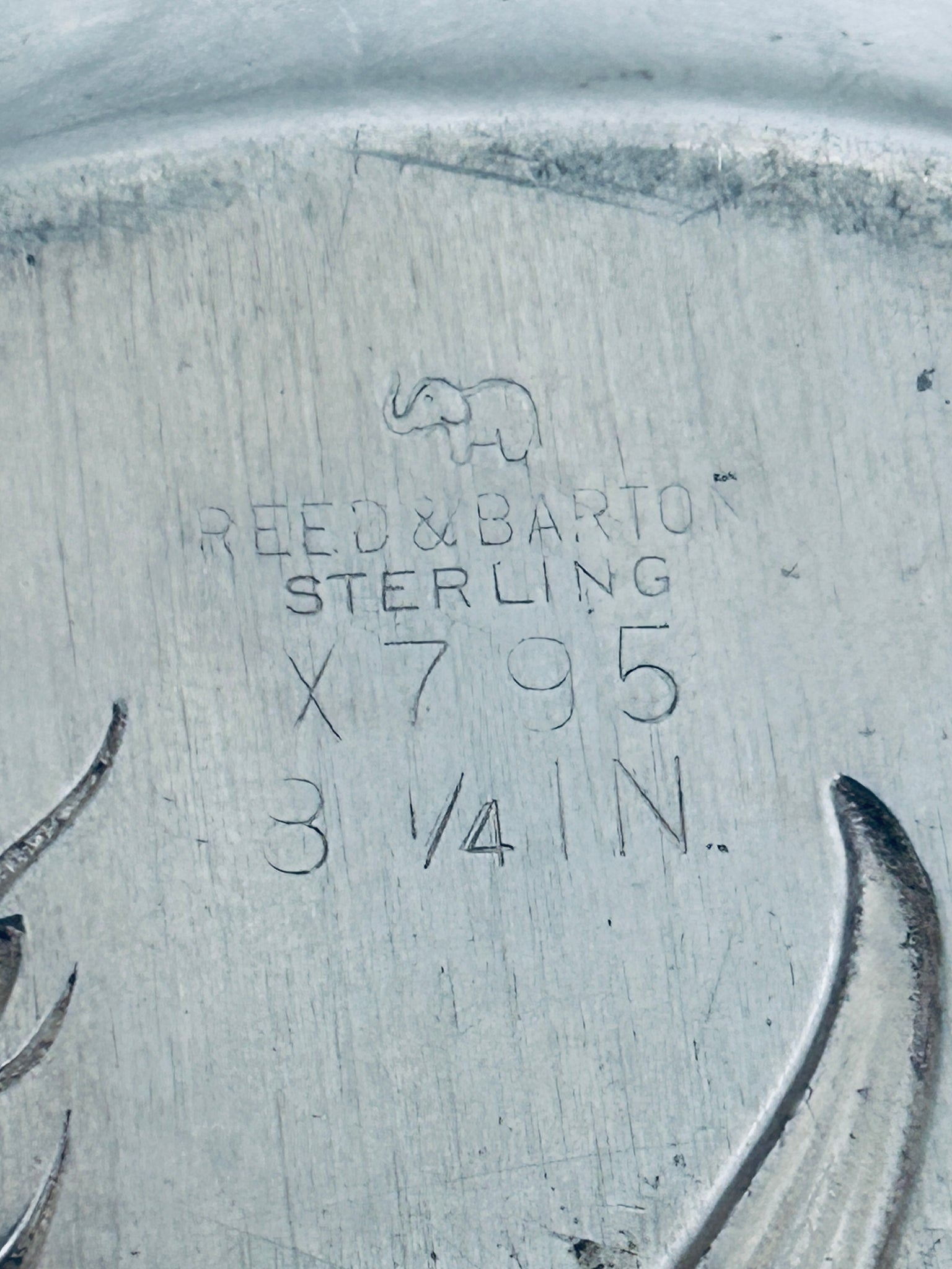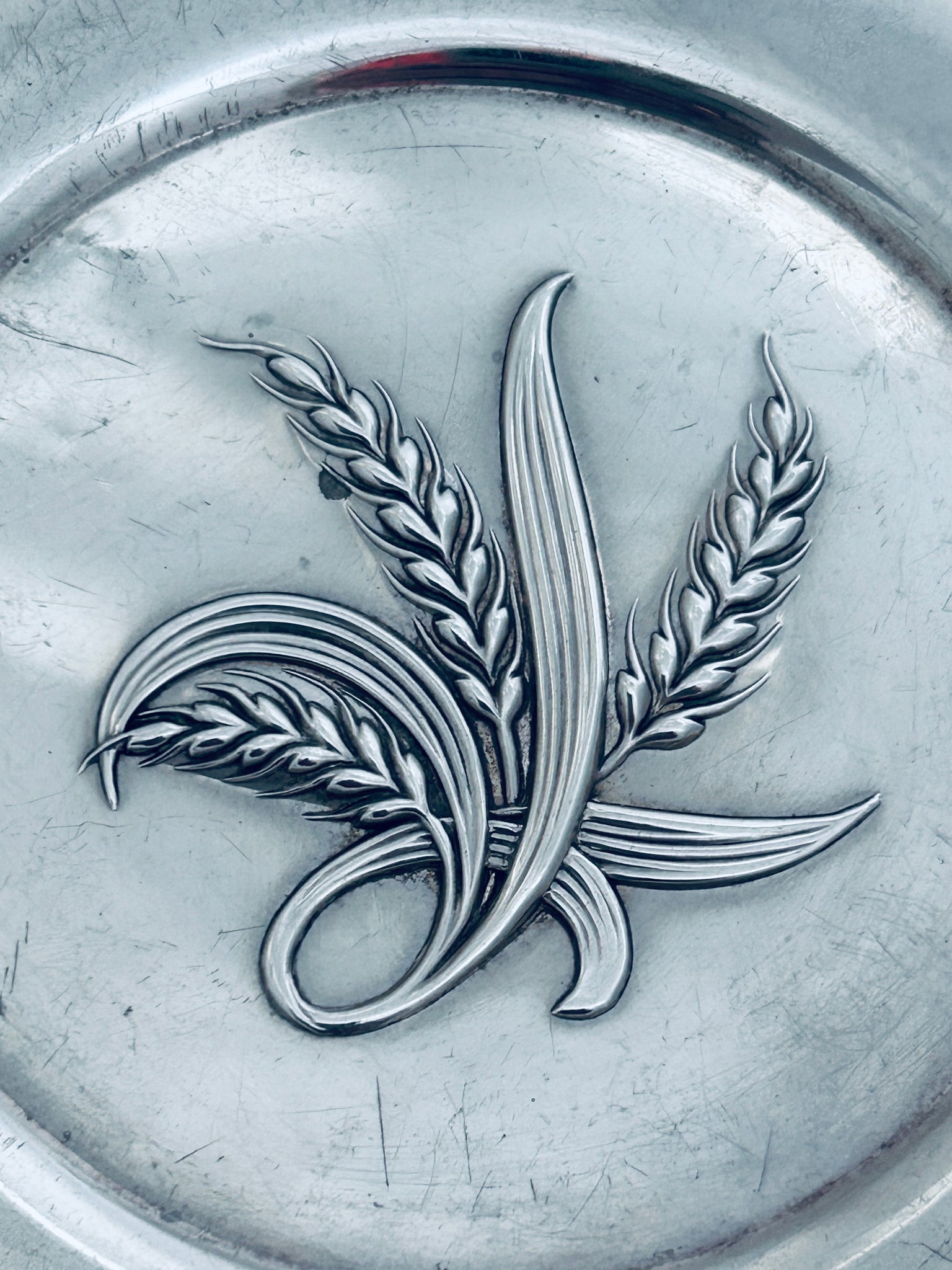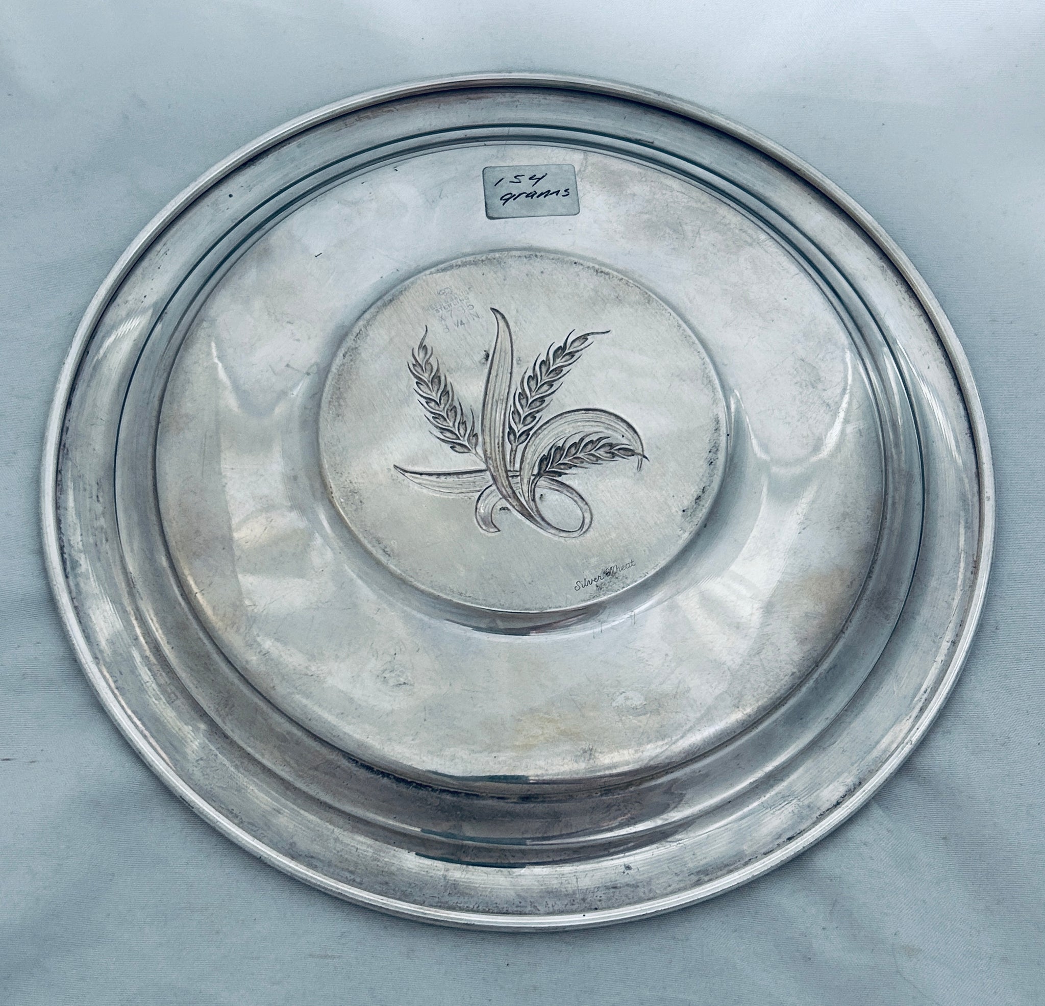 A nice piece of American silver, this plate is in the 'Silver Wheat' collection of well known firm Reed and Barton. It is the 8 1/4 inch size. It is in good condition, one small dent and some scratches from use.
