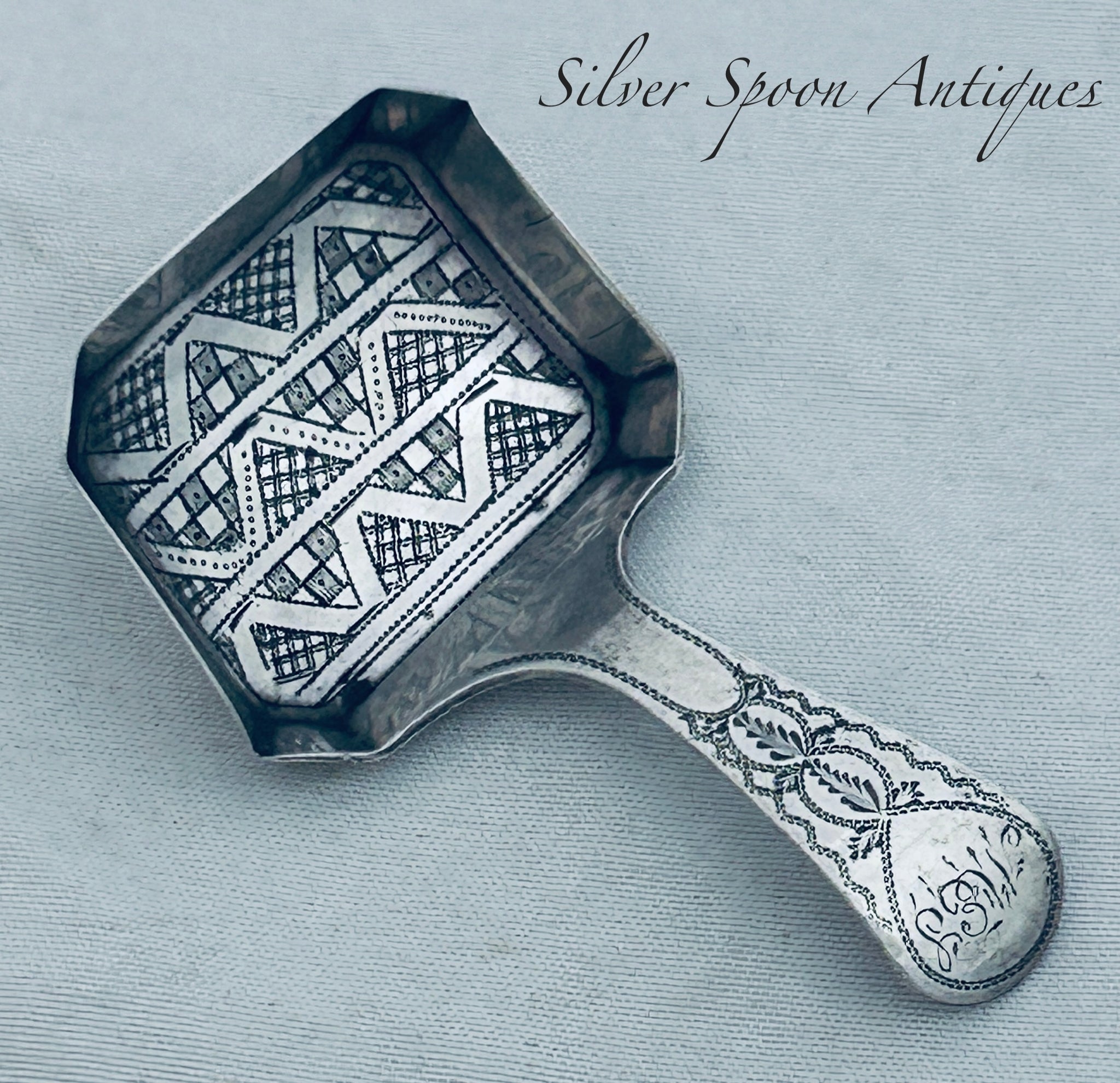 We love the bright-cut design of this Georgian Caddy spoon. It has a square shaped bowl and a period monogram. It was made by Cocks & Bettridge in Birmingham in 1811. It is in good condition, there is a split on one corner of the bowl.