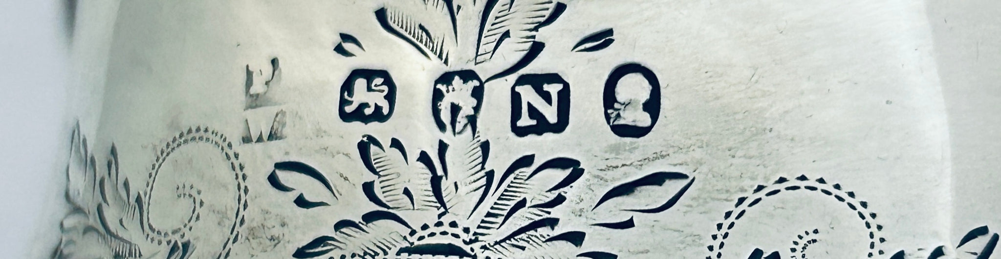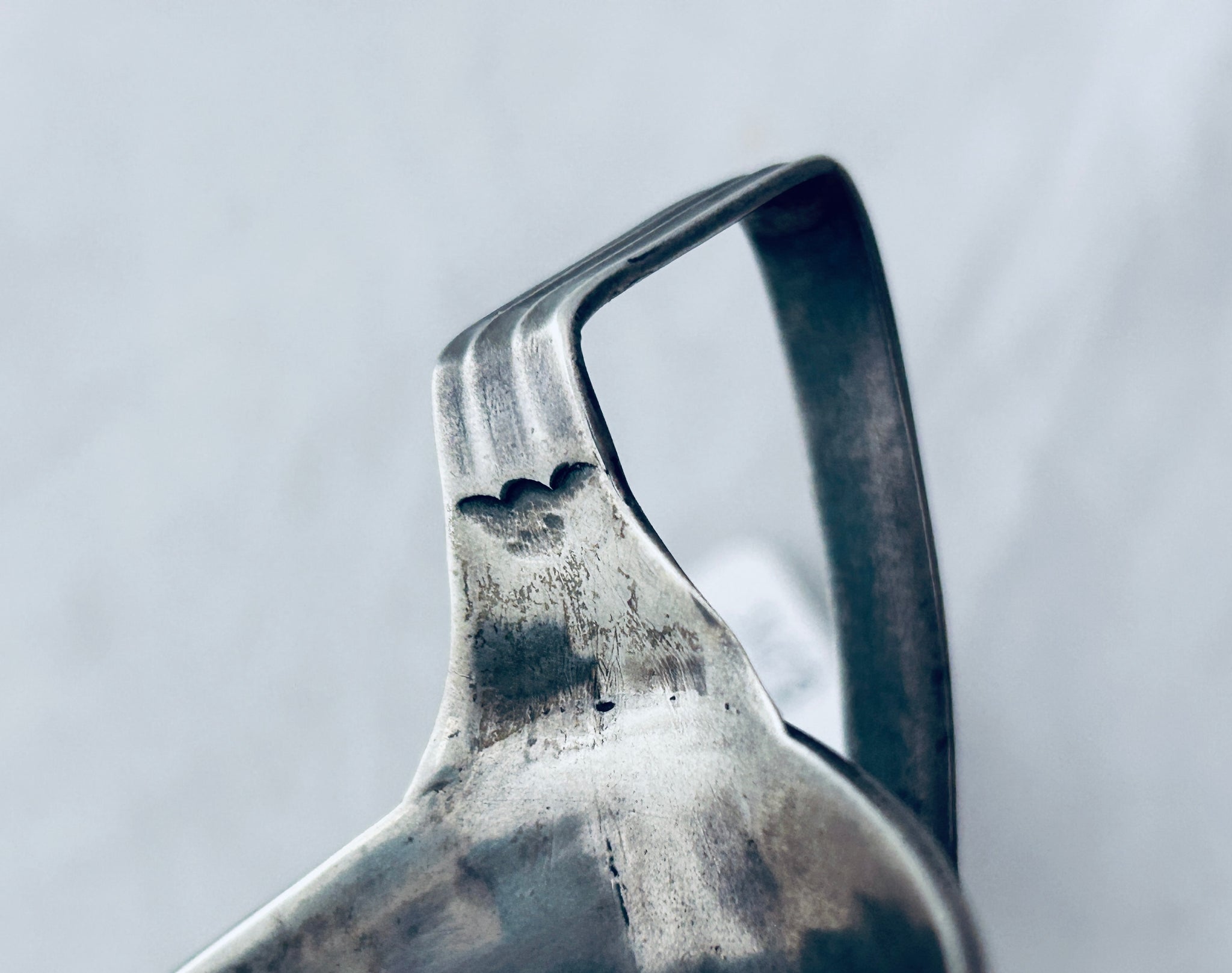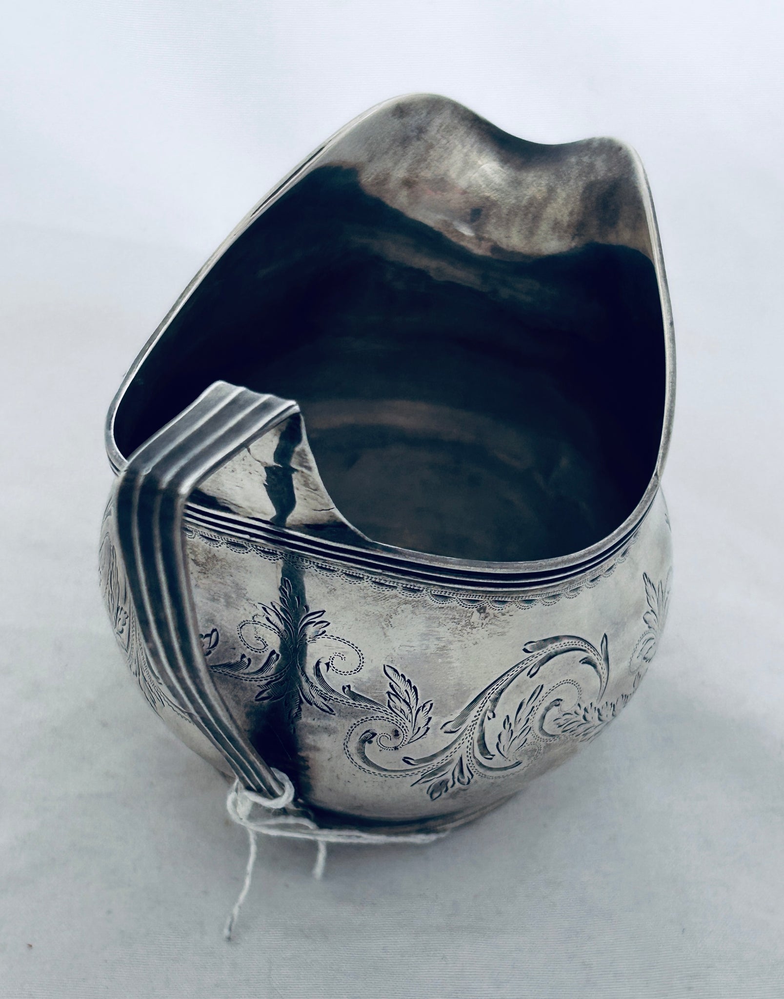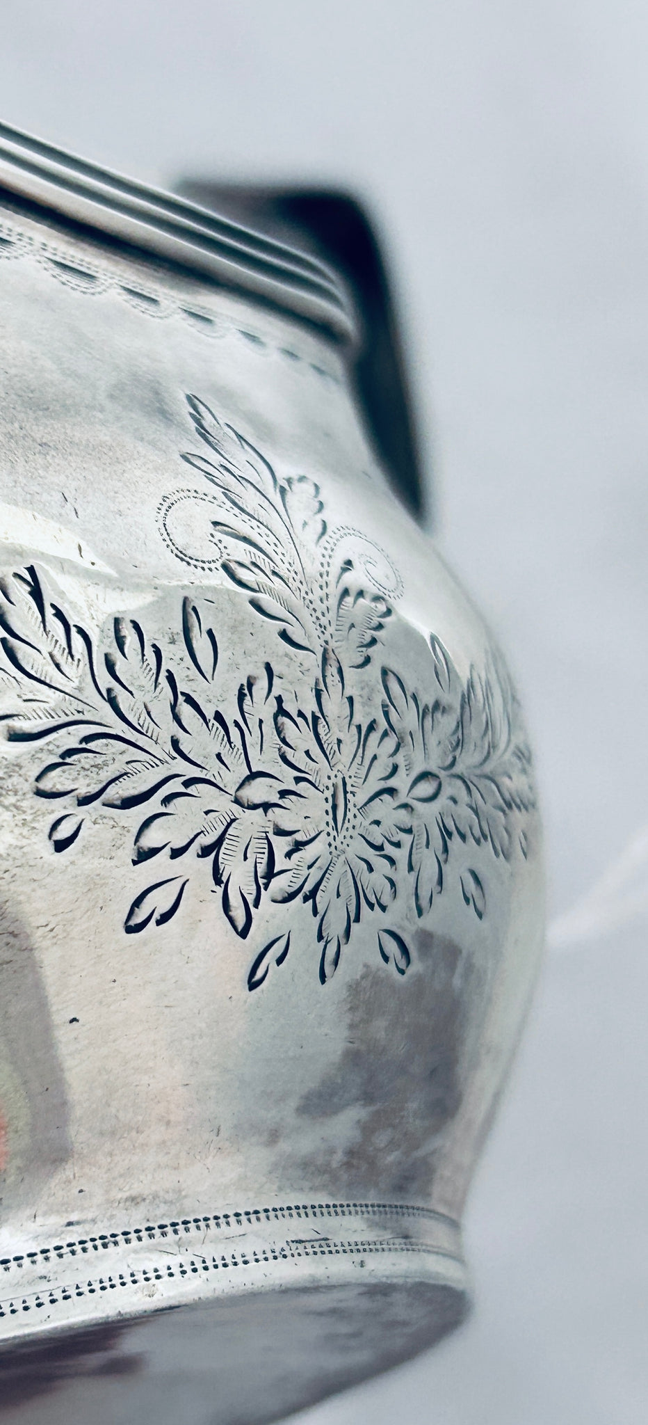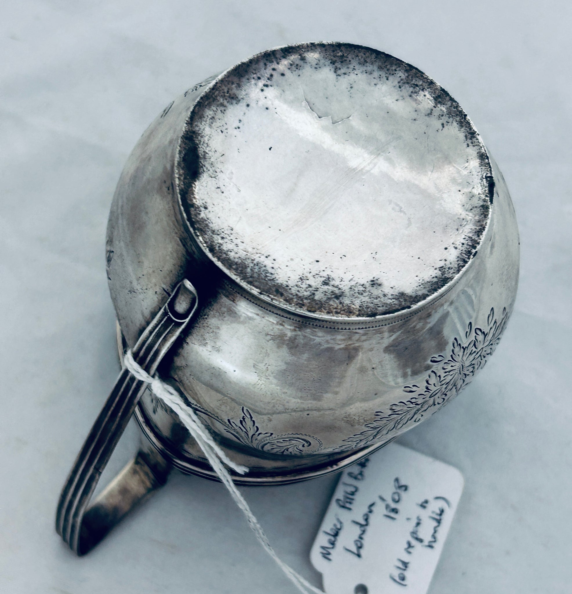 A nice useful piece of silver with nice bright-cut decoration. It was made in London in 1808. The maker's mark is a little rubbed but is probably for Peter and William Bateman. It is in good overall condition, there appears to be an old repair to the handle and a slight dent on the back.