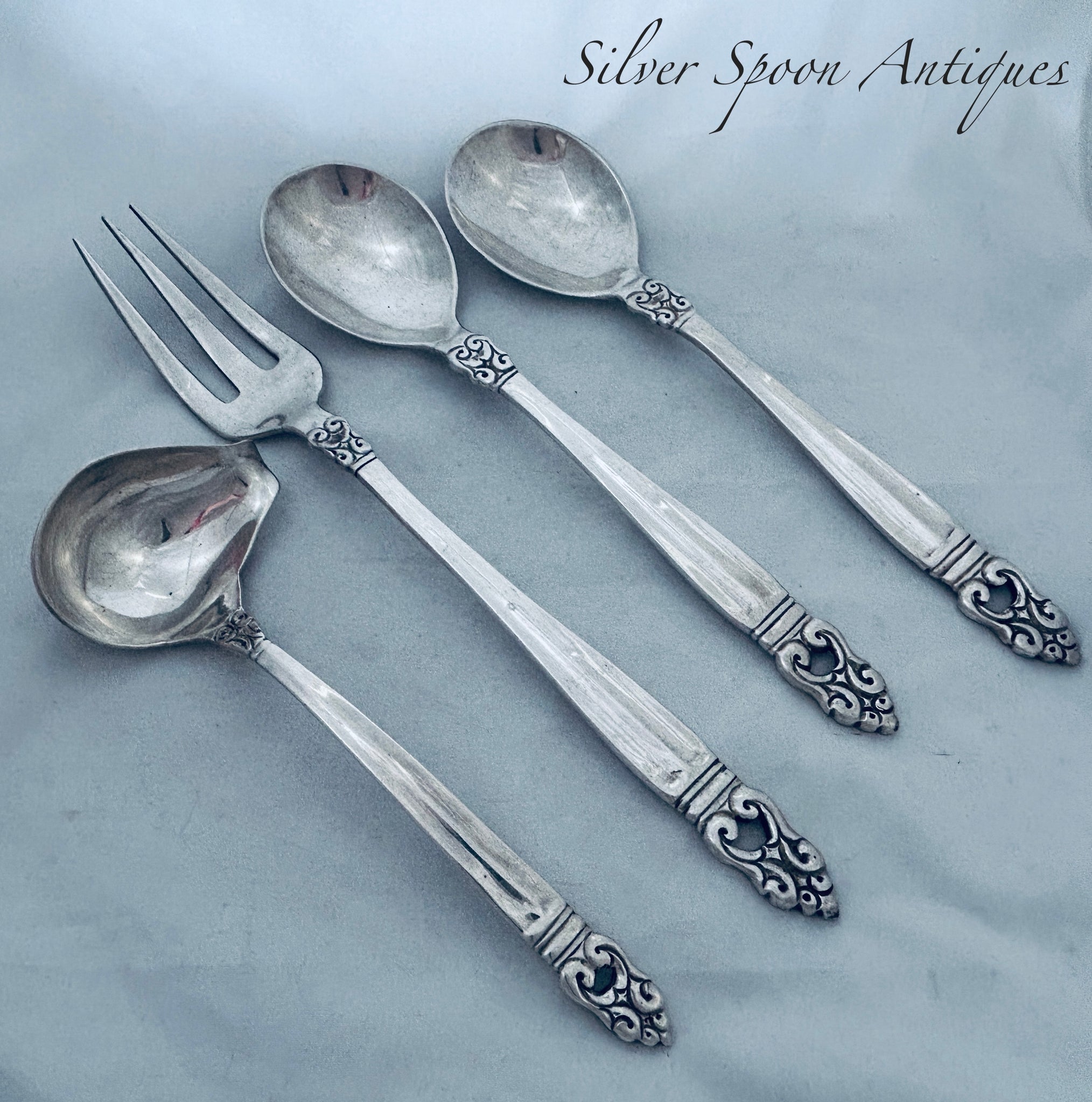 A good set of Mexican silver, it is made copying Jensen's 'Acorn' pattern (a little cruder than the real thing). A lot of silver was made for the tourist market in the middle of the twentieth century. They are all in good condition.