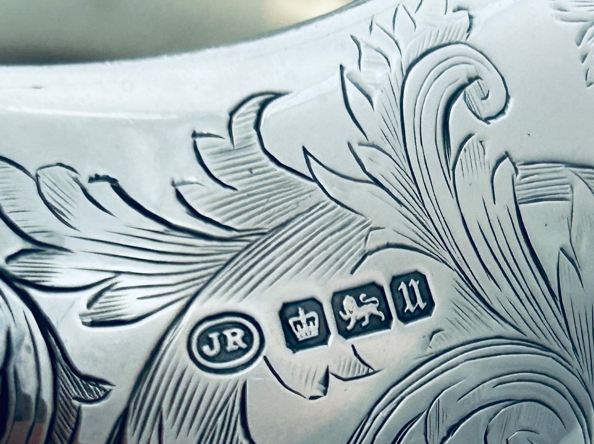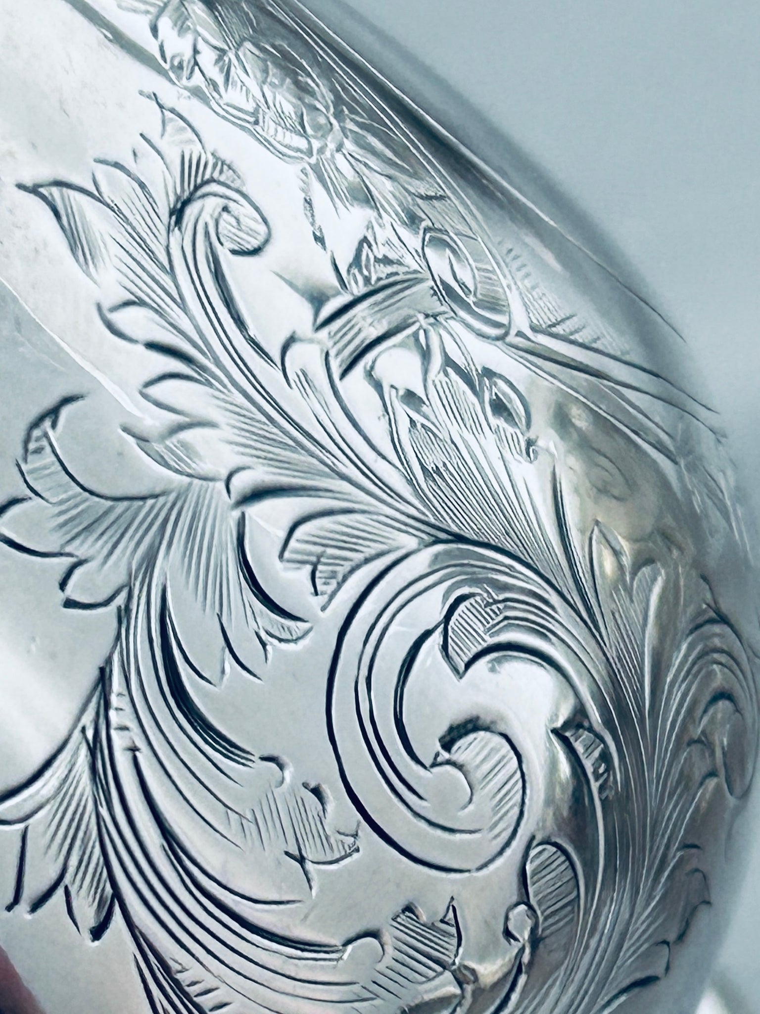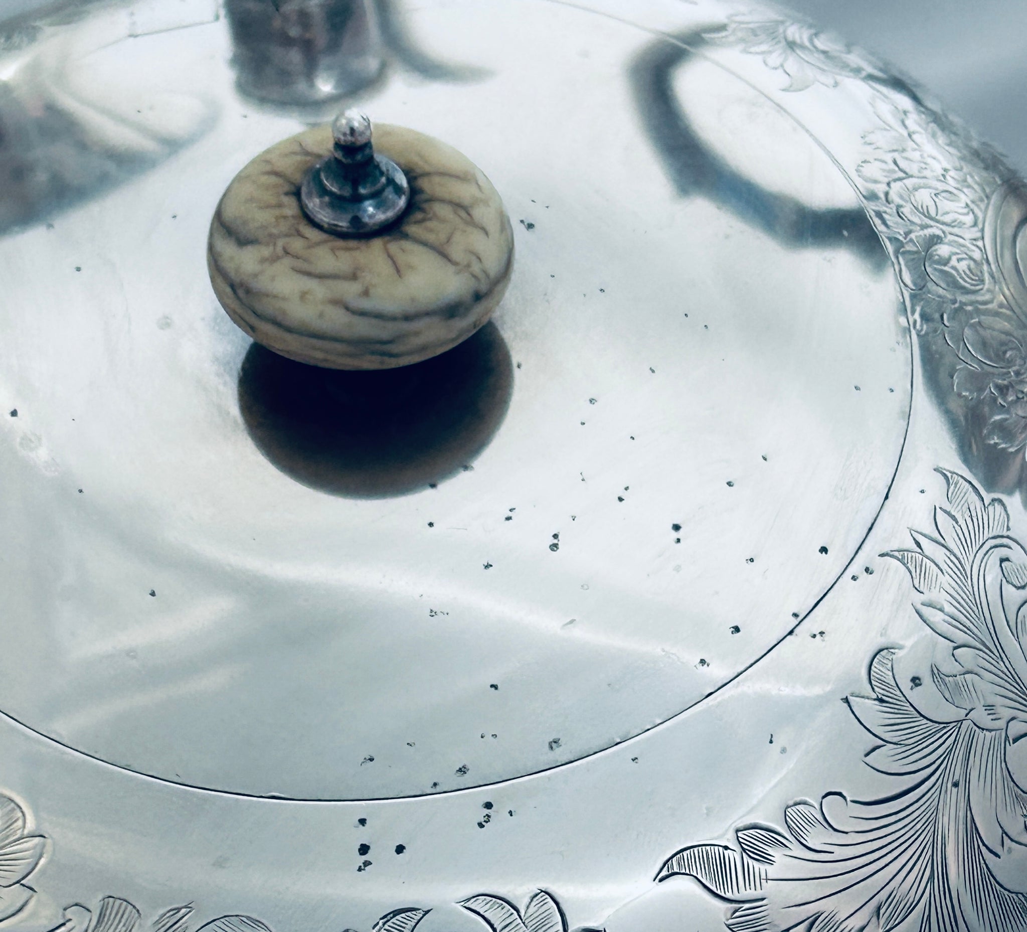A lovely classical shape, this five piece tea set has restrained engraving on each piece. It consists of a coffee pot, teapot, hot water jug, sugar bowl and milk jug. It was made by John Round & Son Ltd in Sheffield in 1912. It has a period engraving inside the lid of the teapot and each piece is mongrammed 'C'. It is in good overall condition, the teapot has some spot marking on the top and a small dent.
