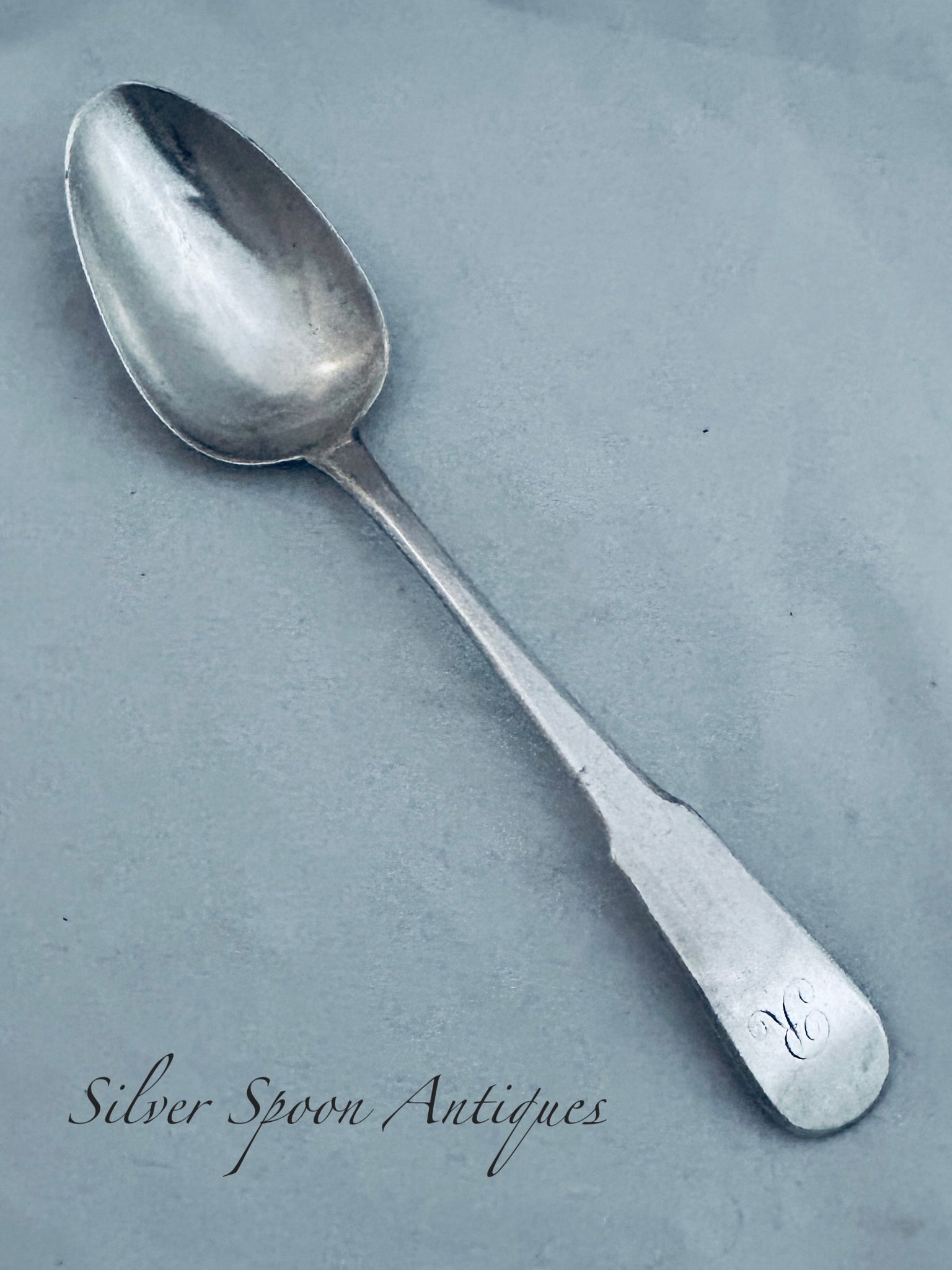 A good fiddle pattern Scottish sterling tablespoon. It was amde by Alexander Henderson in Edinburgh in 1812. It is monogrammed 'R'. It is in good overall condition, there is some slight wear to the bowl.
